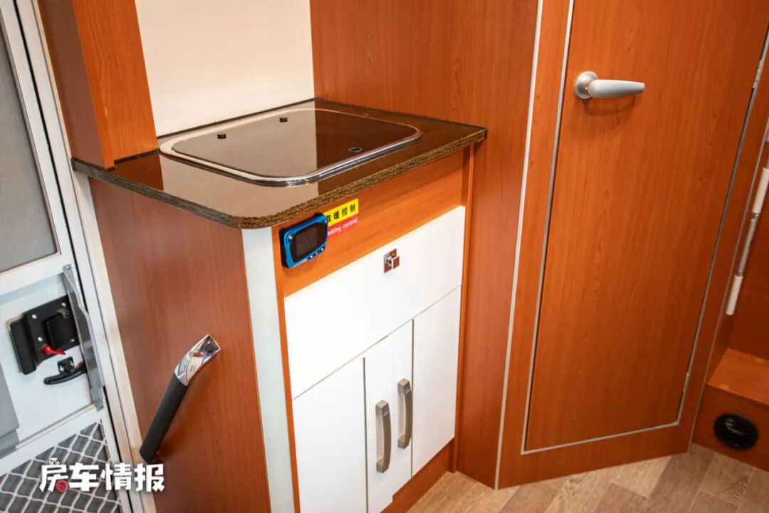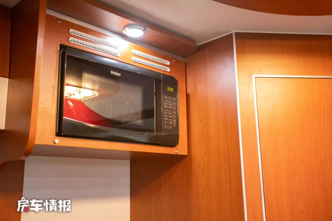 乘客门后方是一个橱柜,台面上提供了一个带盖的洗菜池,下方则是储物空间,橱柜上方镶嵌了一台微波炉,方便平时热菜热放。