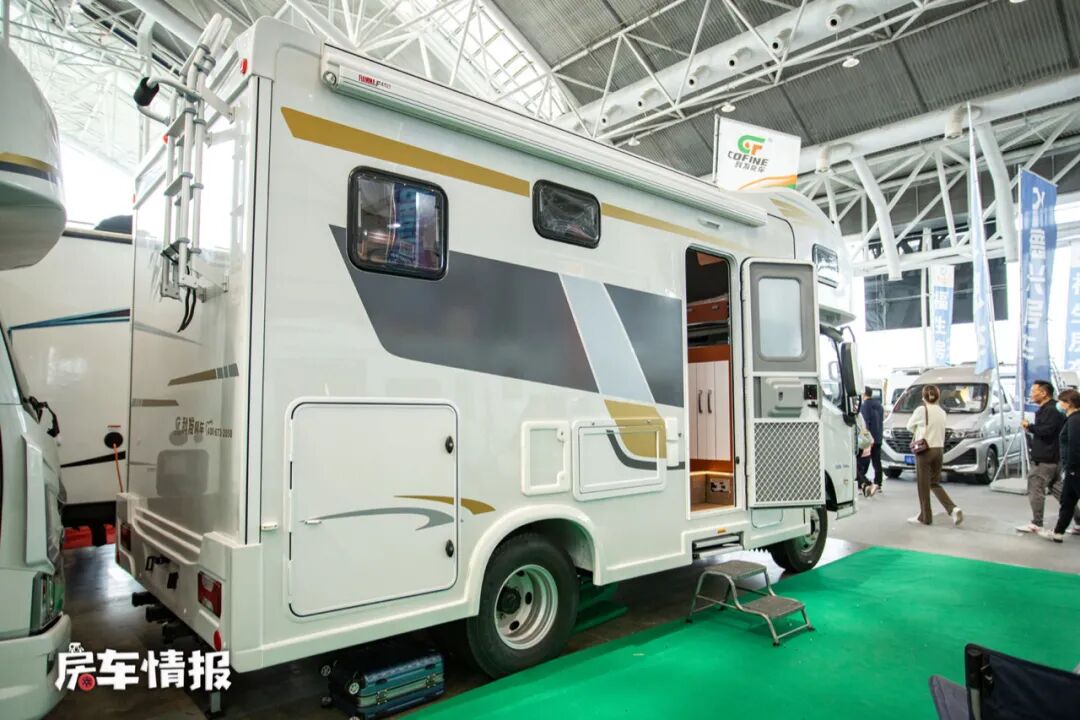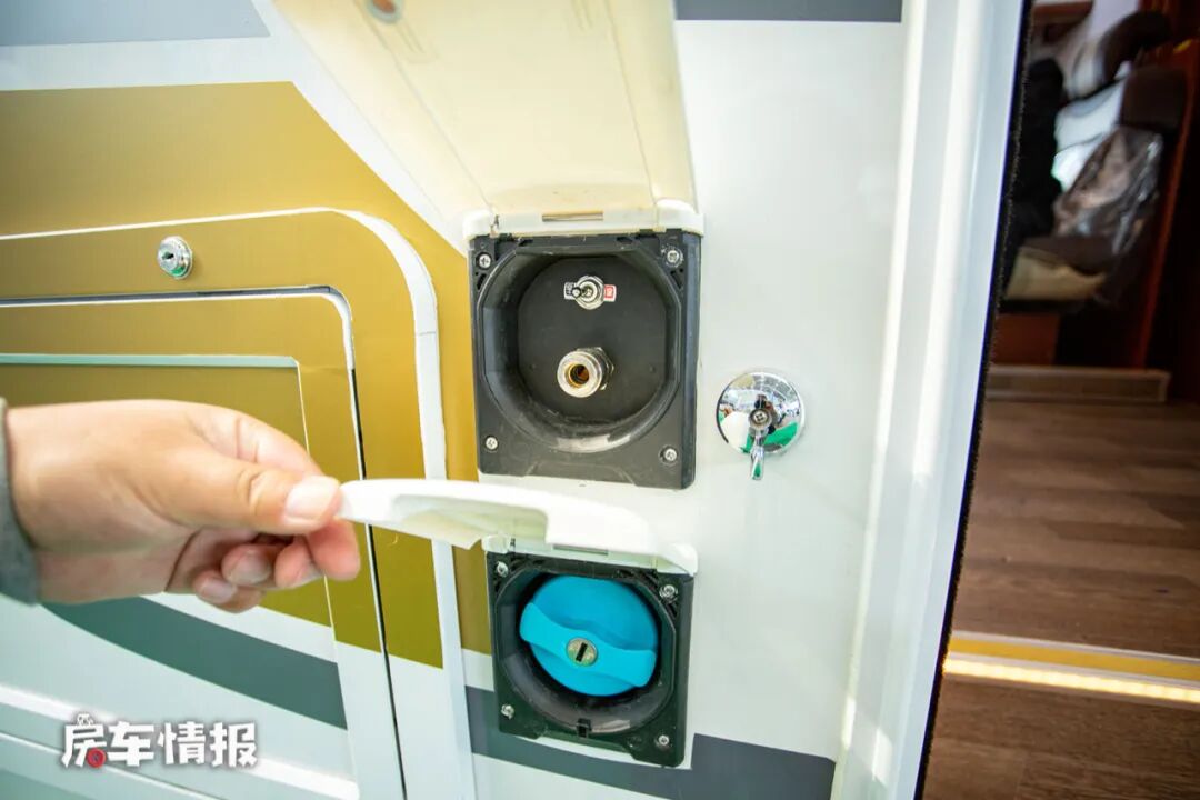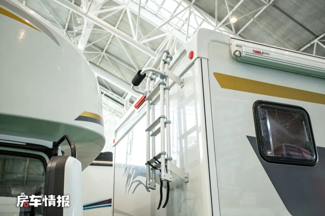 除此之外,车身后部还提供了一个贯通式的行李舱,平时可以存放大件的行李物品,尾部则配备了一个爬梯,方便平时上车检查。车身外部还提供了水电接驳口,方便平时为房车补给。