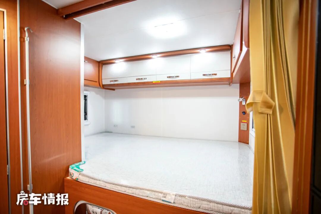 车厢的尾部是整车的休息区,采用的横置双人床的设计,双人床的宽度有1400mm,足够容纳两个成年人休息使用。