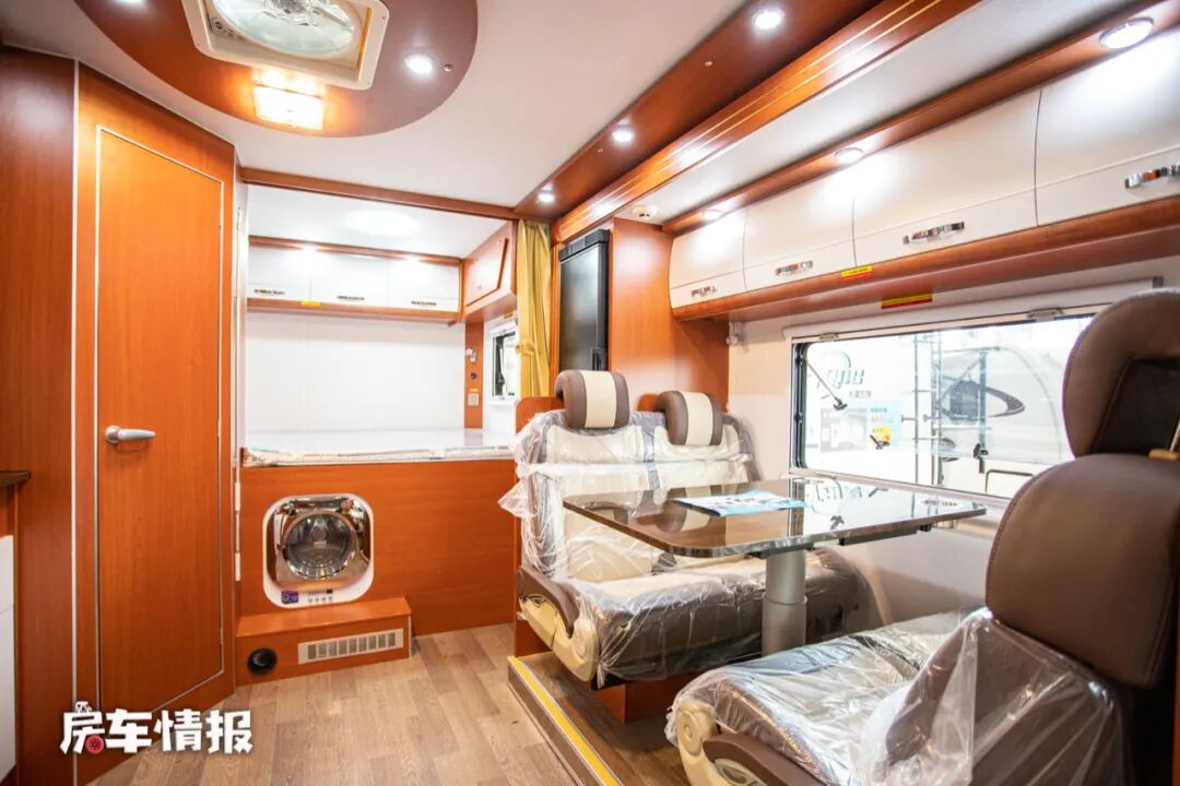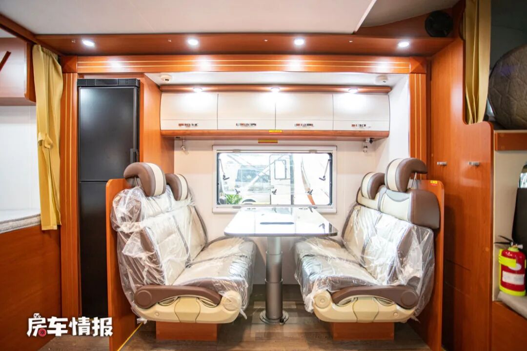 车厢内部的风格相较于前方全黑色系的驾驶室来说,采用了更多的暖色调家具和灯光。