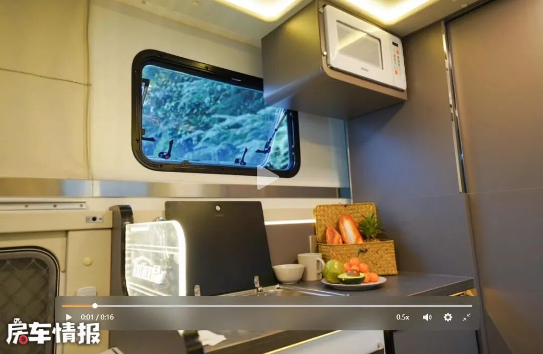 厨房区域位于车厢右侧,整体形式和主流车型上的差不多,提供了微波炉、洗菜池、冰箱等基础设备,如果想要爆炒的话,预计还得使用外置炉灶。