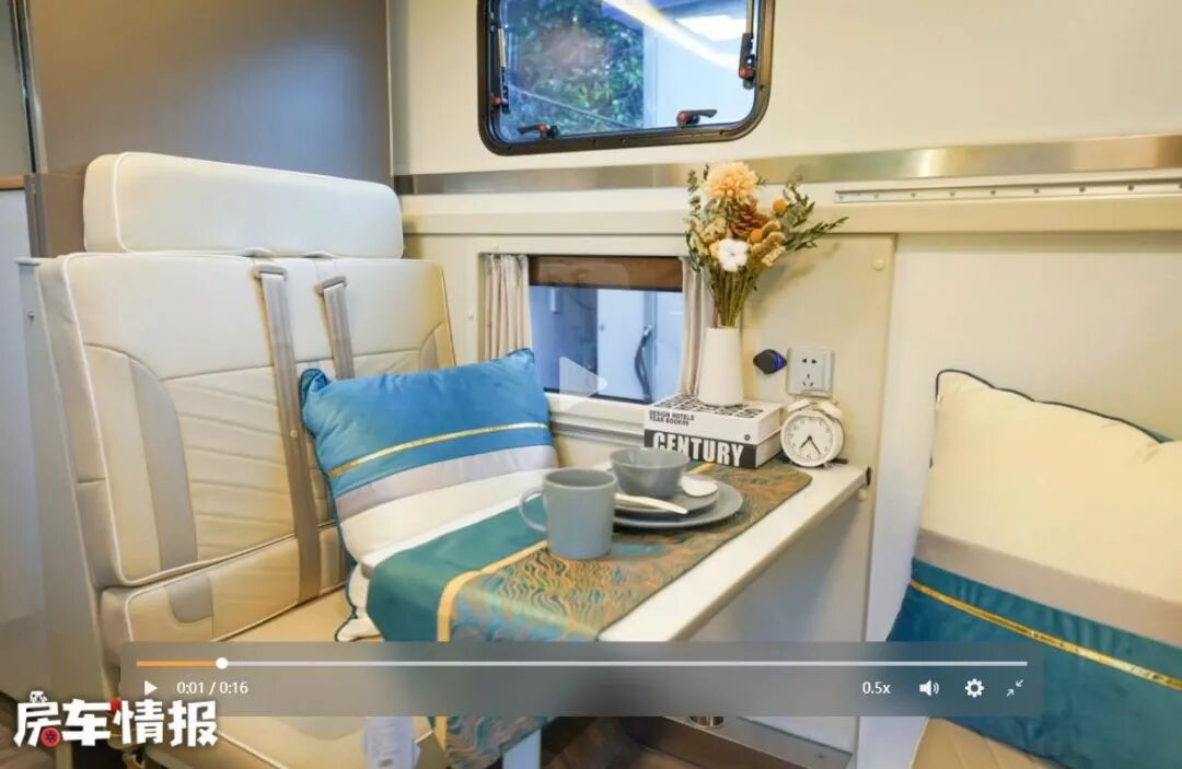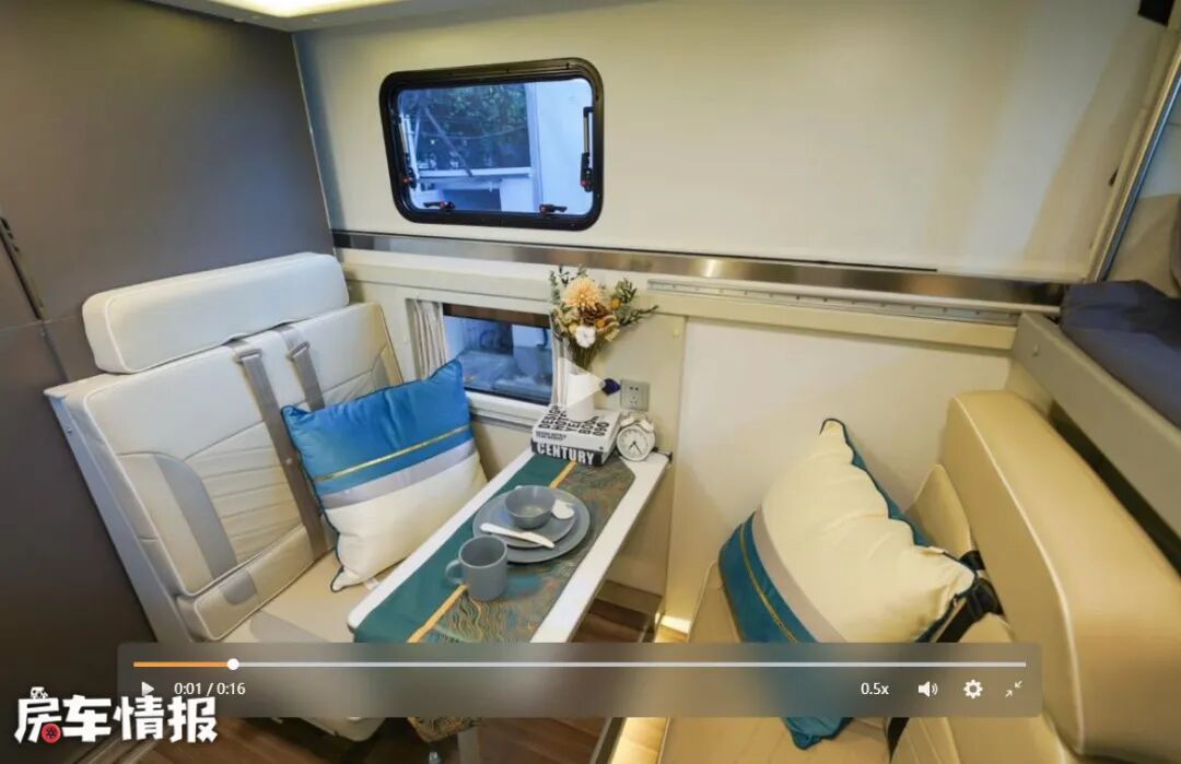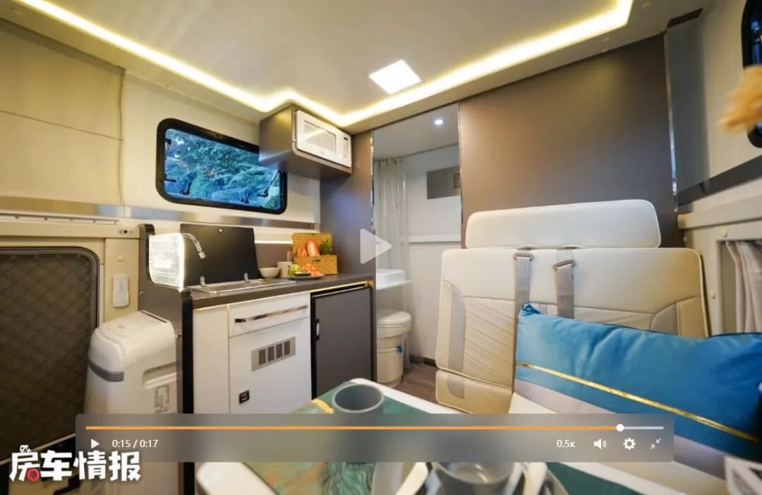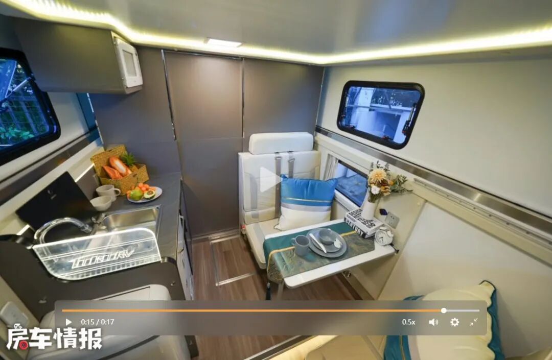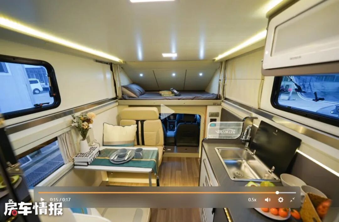 生活区左侧提供了四人对卡座沙发,更重要的是四个座椅均配有安全带,这也就意味着这款车会是核载6人,为什么会这样呢?还是源于这个硬升顶的设计,在厂家公布的一段动态视频中,我们看到这款车在行驶中车顶是升起的状态,要知道软顶车顶是绝对做不到的,想必这也是这款车采用硬升顶的原因之一,基于此我觉得这款新车未来还有一个玩法:日常行车可长期使用车顶升起状态,当遇到限高、地库时,可以让乘坐人员下车,将车顶降下通过后再上车,大家觉得如何呢?