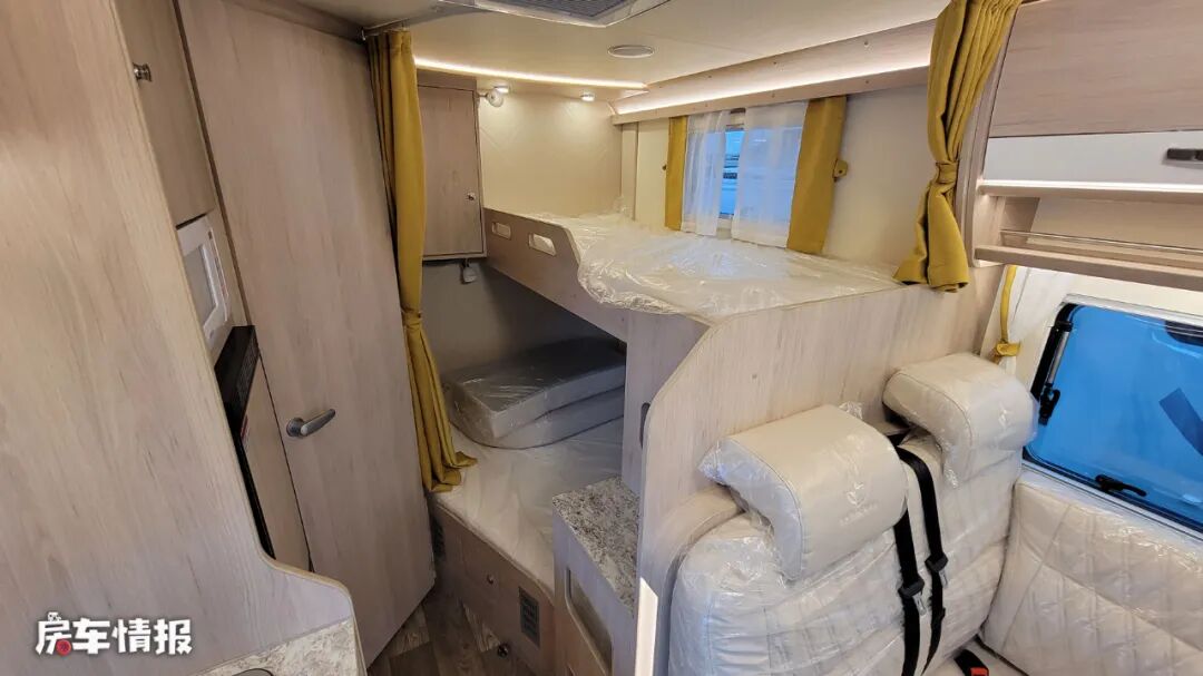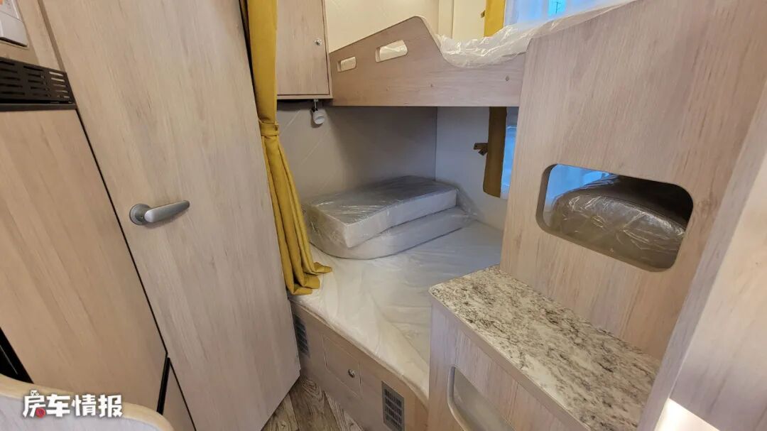 全车的休息区是采用了纵置子母床的设计,下床的尺寸为1920*1350mm,上床的尺寸为1920*900mm,上下一共可以容纳三个人使用,同时在上床的床头处还有一个小型的储物吊柜,存放一些贴身的物品也比较安全。