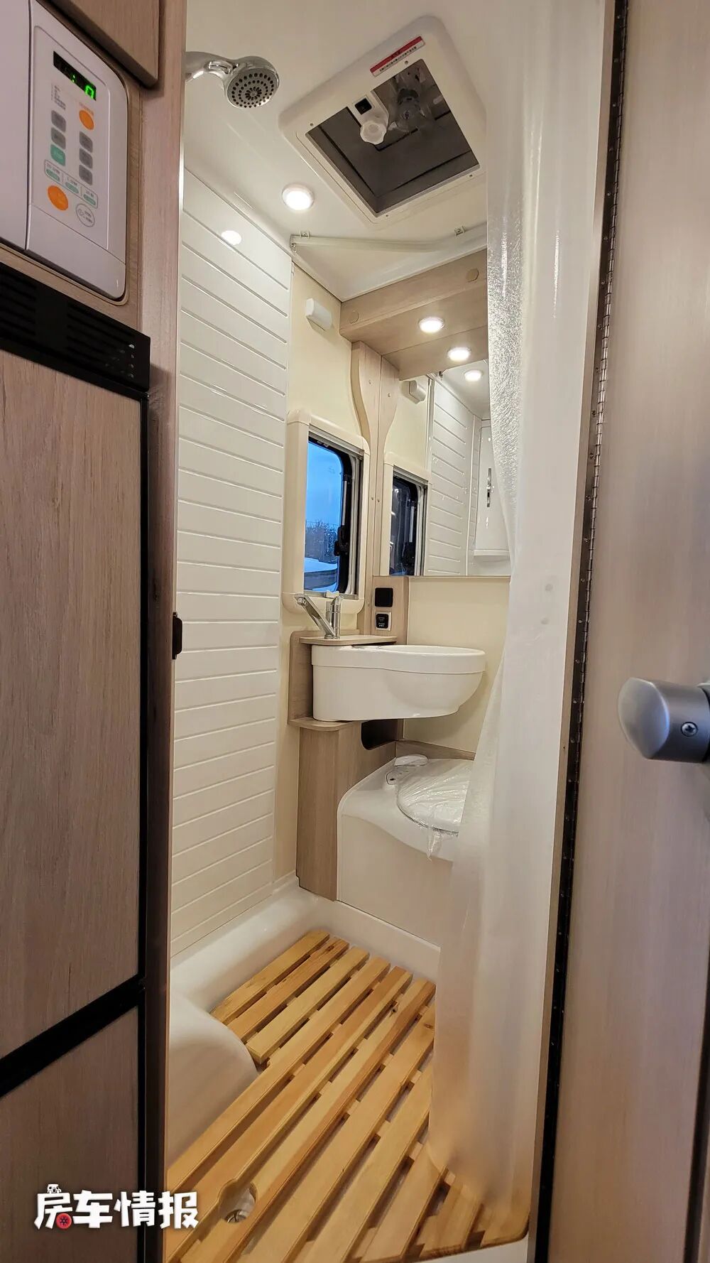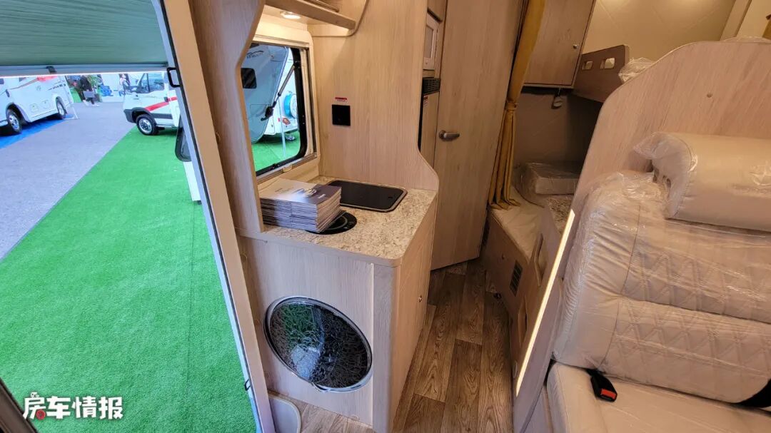 相较于大空间的会客区,车内的厨房操作台显得有的小巧了,整体的尺寸并不是很大,也没有配置拓展的区域,台面上带有电磁炉和不锈钢洗菜池,侧面则是一台嵌入的洗衣机,操作台后方也配备了微波炉和一台上下双开门的冰箱,出行的基本烹饪需求还是可以解决的。