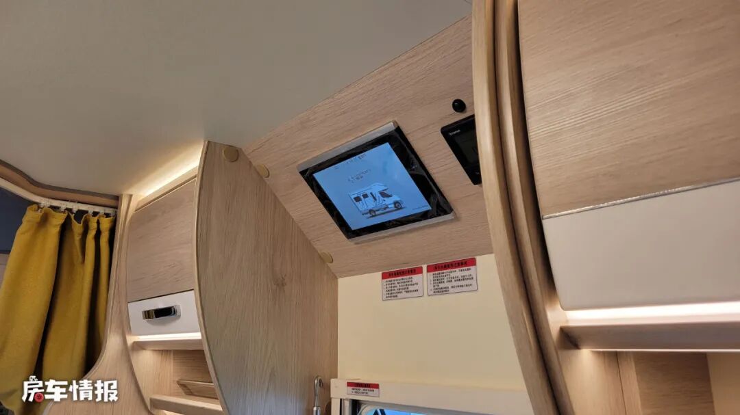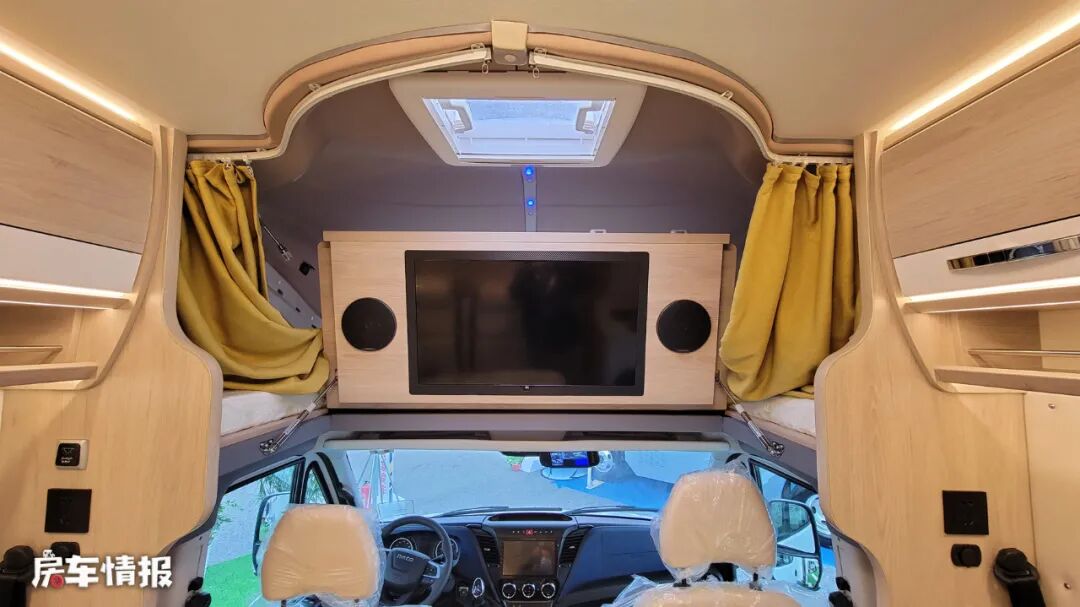 除此之外,在最前方的驾驶室上方的额头区域内,还标配了一张双人额头床,也能够容纳两名成年人使用,翻起床板还可以看到下方隐藏了一台32寸的液晶电视,可以为平时的旅居生活提供娱乐项目。