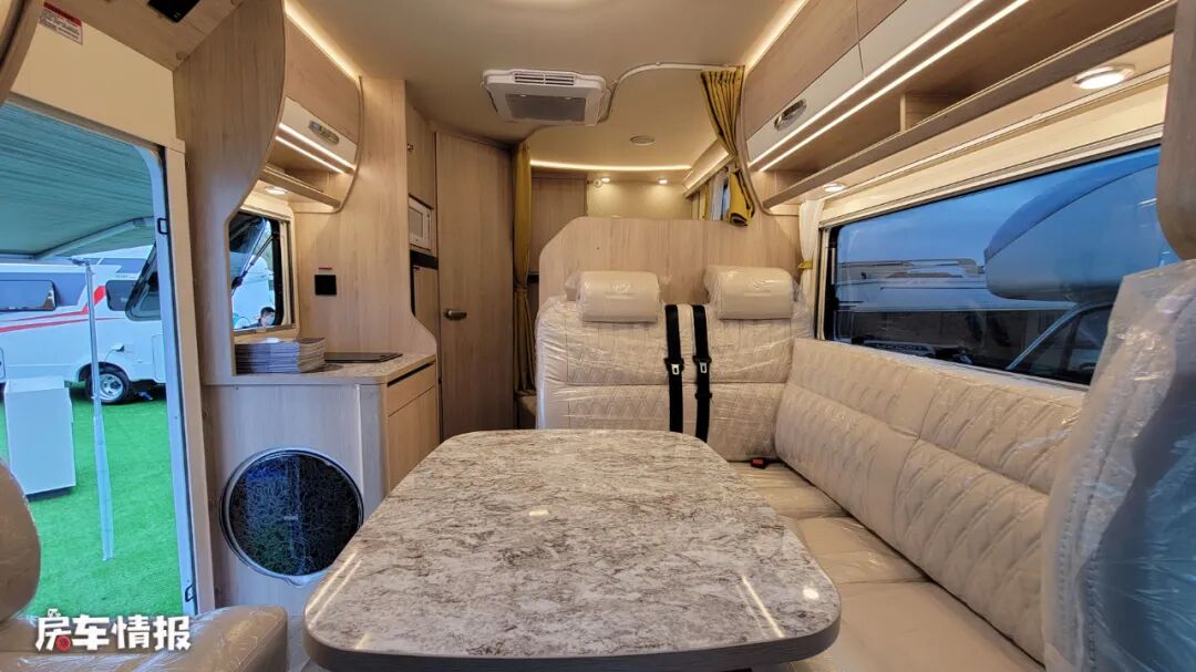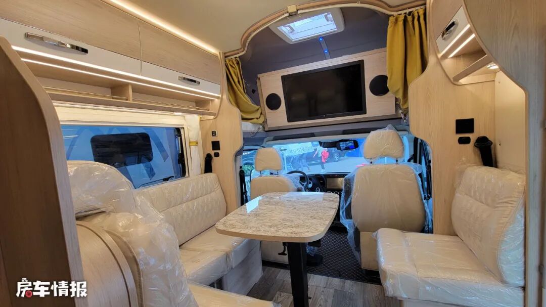 进入车厢内,整体的氛围还是比较温馨的,采用了大面积的米黄色家具和氛围灯,也增加了整辆车的家的氛围感。