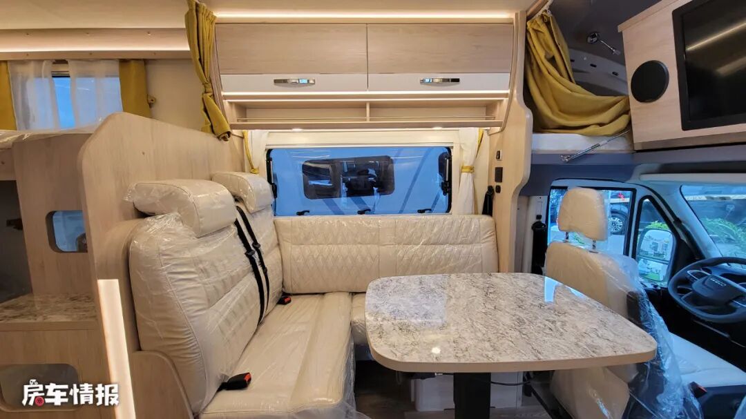位于最前方的会客区内,是采用了当下比较受欢迎也比较实用的L型沙发座椅以及一台升降餐桌组成的,结合乘客门前方的单人座椅,平时可以容纳更多人在这里就餐小聚,同时两侧顶部还配置了储物吊柜,存放一些日常用品也方便后期拿取。