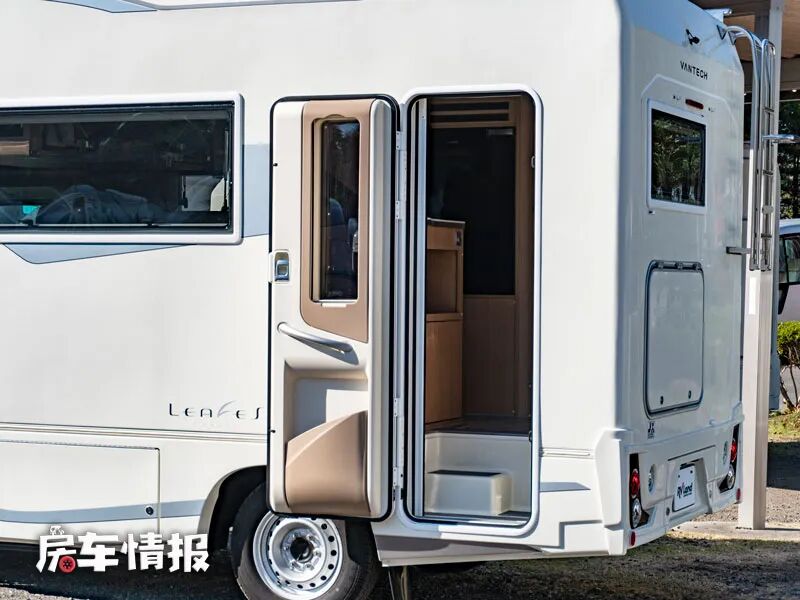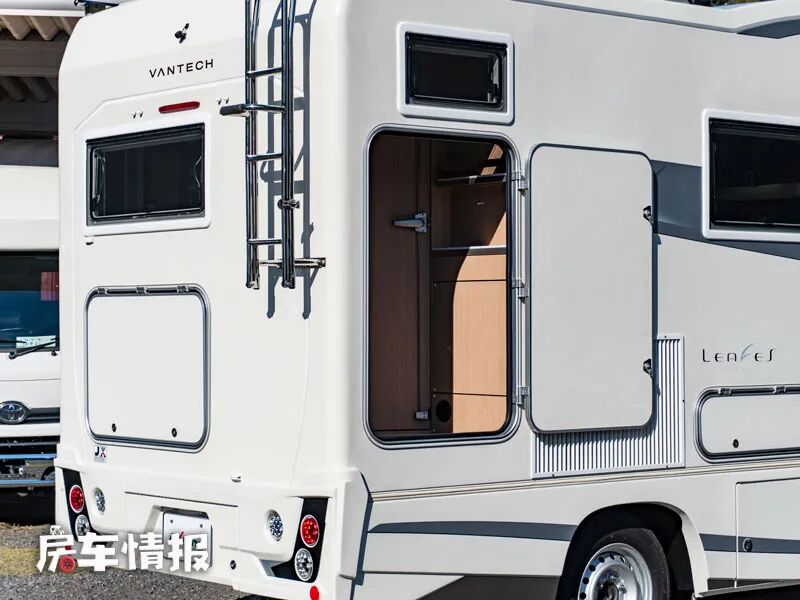 车身外部虽然看似有很多功能门,但绝大多数都是储物箱门,并不具备一些基础的生活设施,另外在车身尾部还配置了爬梯,以方便后期为车辆进行检查。
