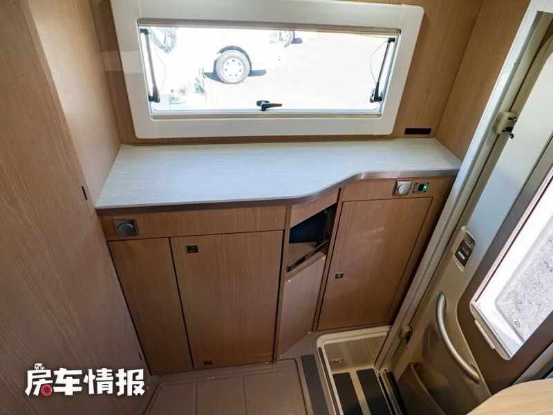 而与之相对的则是一个条形桌,上方的台面可用来备菜,下方的空间则被设计成了一个小型的鞋柜,方便上下车使用。