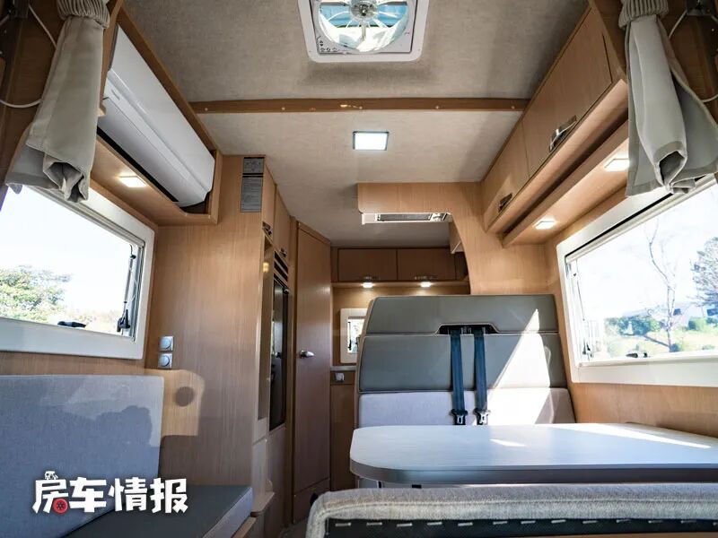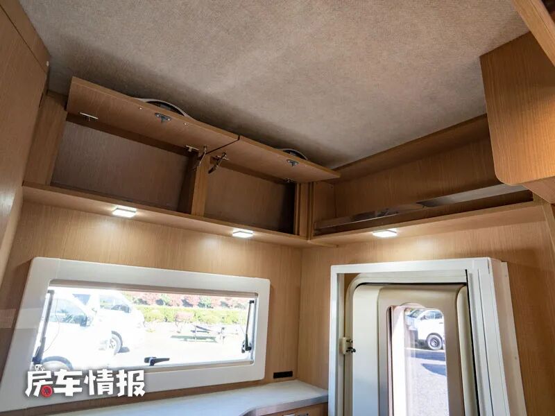 会客区顶部,一侧是提供了储物吊柜,另外一侧则提供了一台家用变频空调,可以调节车内的温度从而达到一个更舒适的居住环境。