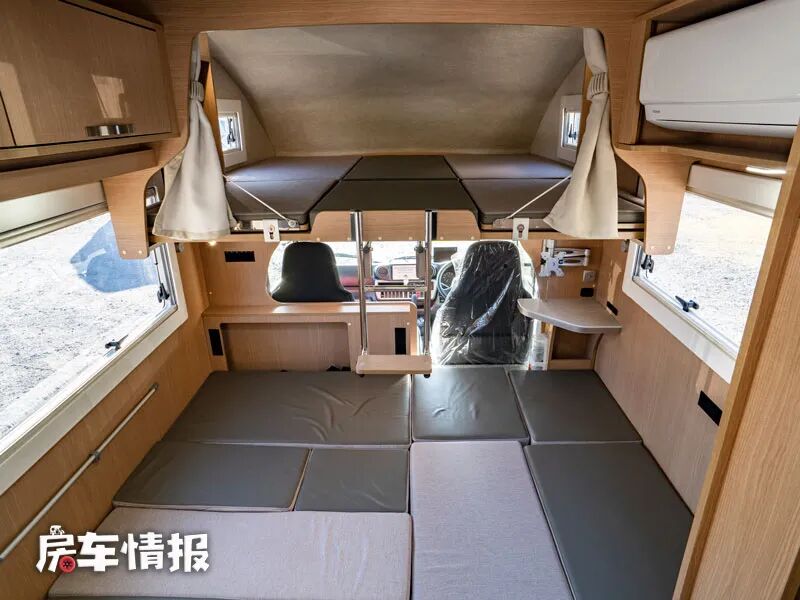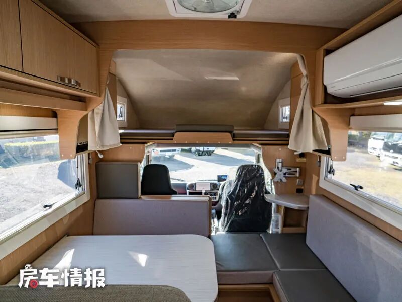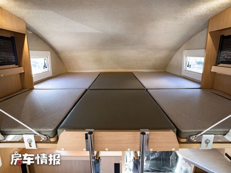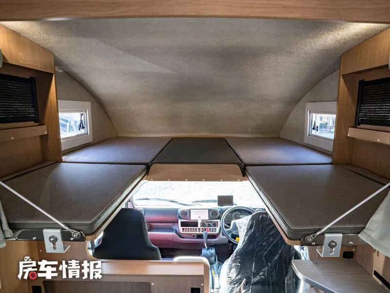 在最前方驾驶室上方的额头区域内,标配了一张两边带有外推窗的额头床,而且还是抽拉式的设计,不用时可以增加下方驾驶室的头部空间,拓展后的额头床也足以躺下两名甚至三名成年人。