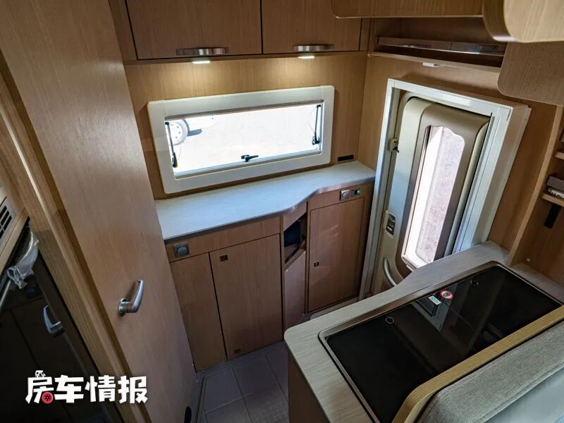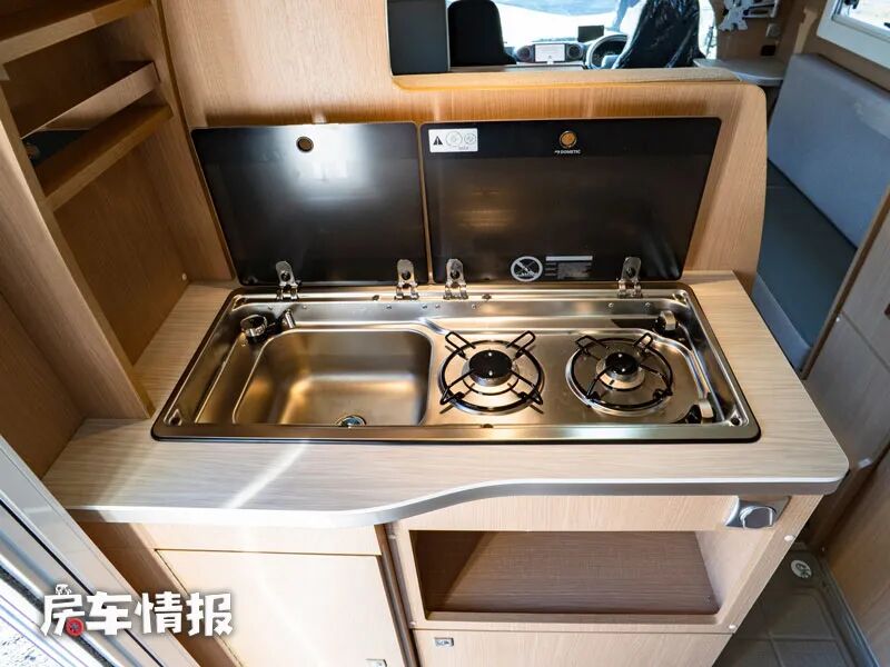 因为采用了后上门的设计,所以这款车也采用了后置厨房区的设计,整个厨房操作台的面积还不错,提供了带盖的不锈钢洗菜池以及双孔燃气灶,顶部还有一小台抽油烟机可以满足日常的使用。