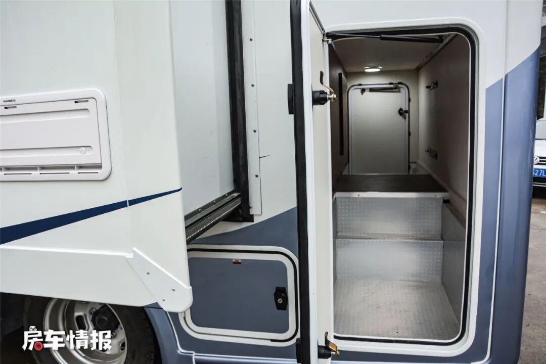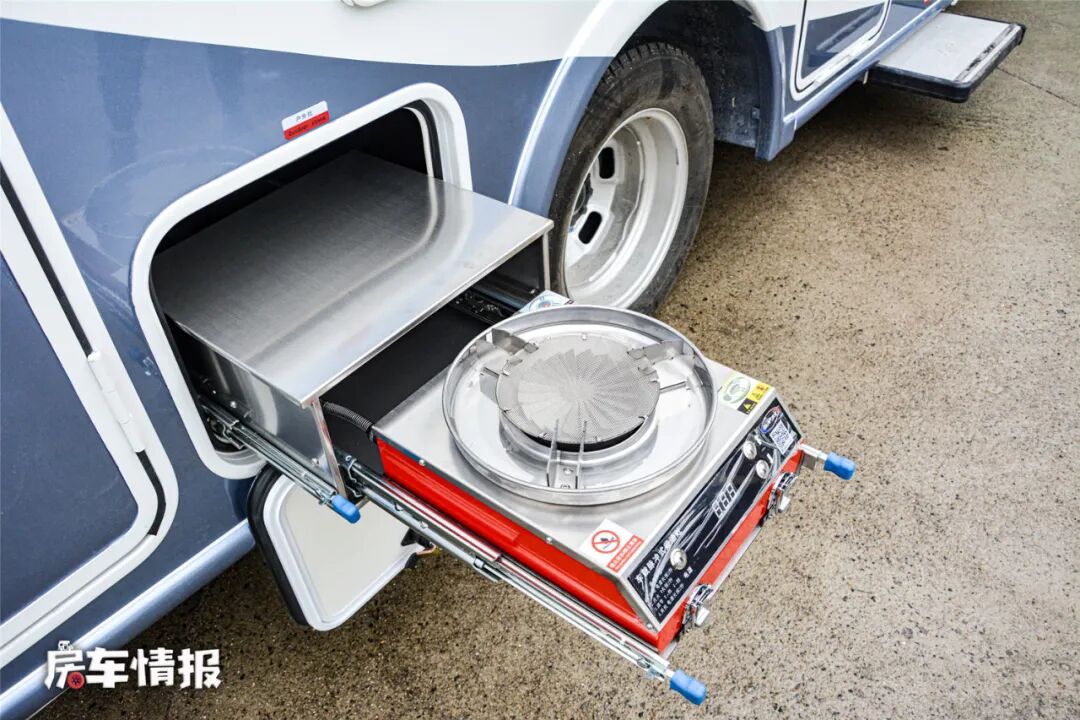 车身外部的生活配件也比较丰富,包括右侧上方的遮阳棚、下方的外置淋雨花洒、抽拉式燃油灶和位于尾部的左右贯通式储物舱,可以满足日常所需。另外值得一提的是这款房车升级了登车踏步,是采用了中控联动式的踏步,即打开乘客门时,踏步就会随之打开,更方便上下门使用。