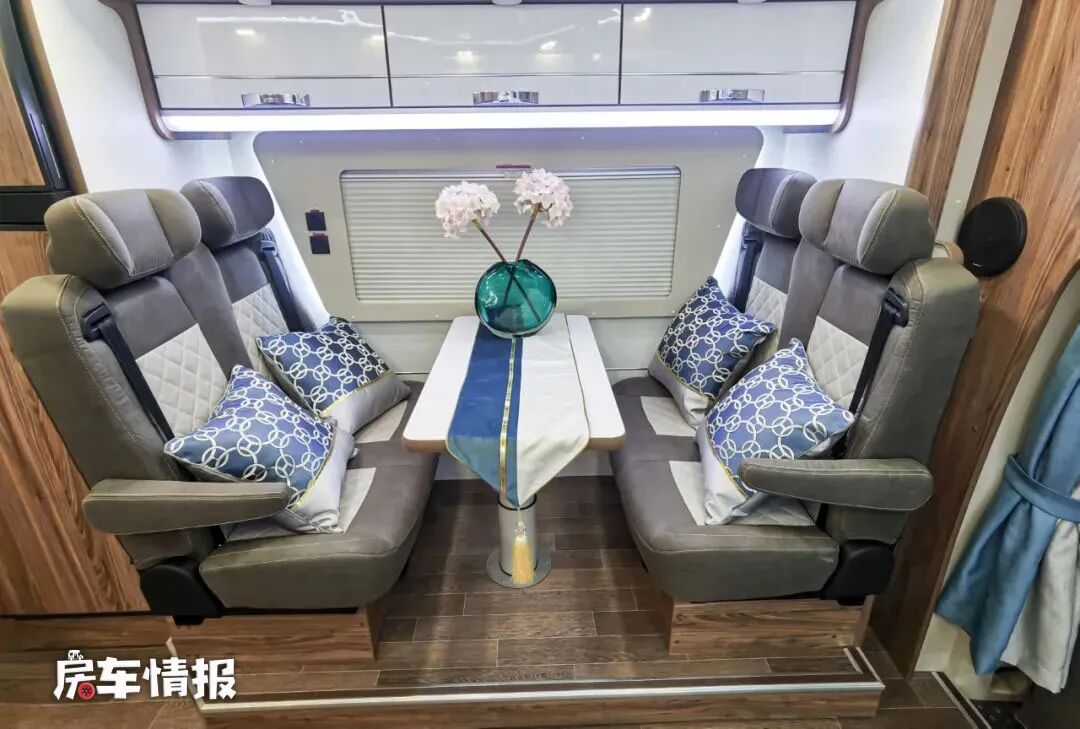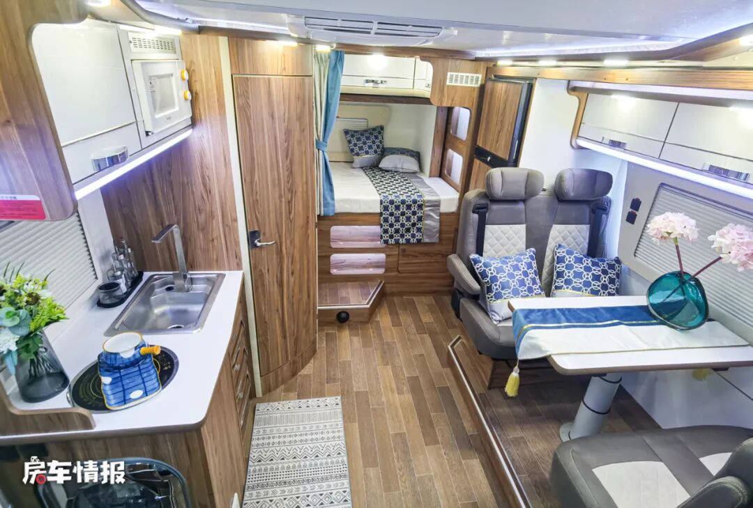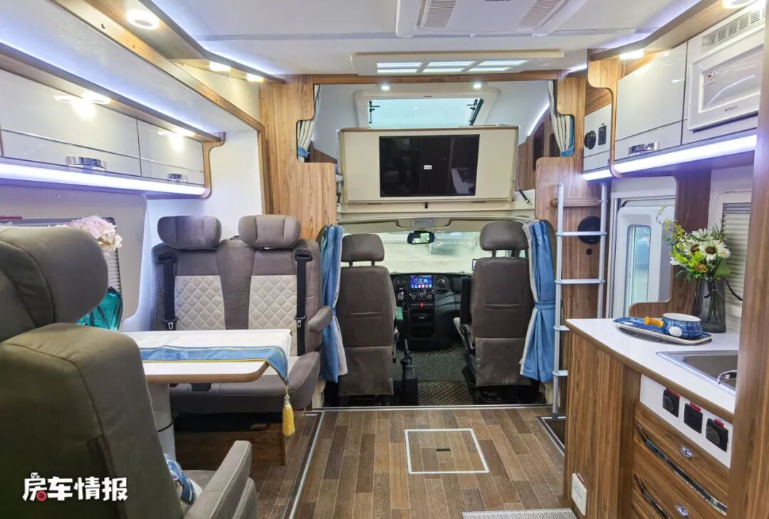 进入车厢内部可以看到,整体的生活区空间还是非常宽敞的,内部的装修风格也延续了拓锐斯特一贯的风格,田园风的设计让人感觉到比较舒适和温馨。