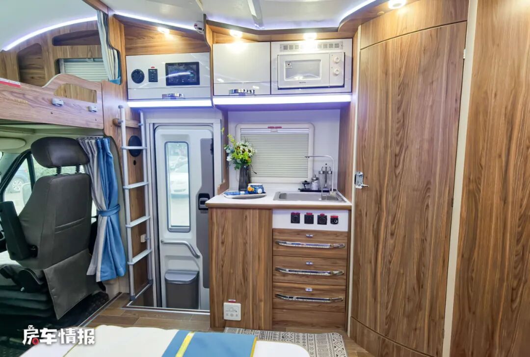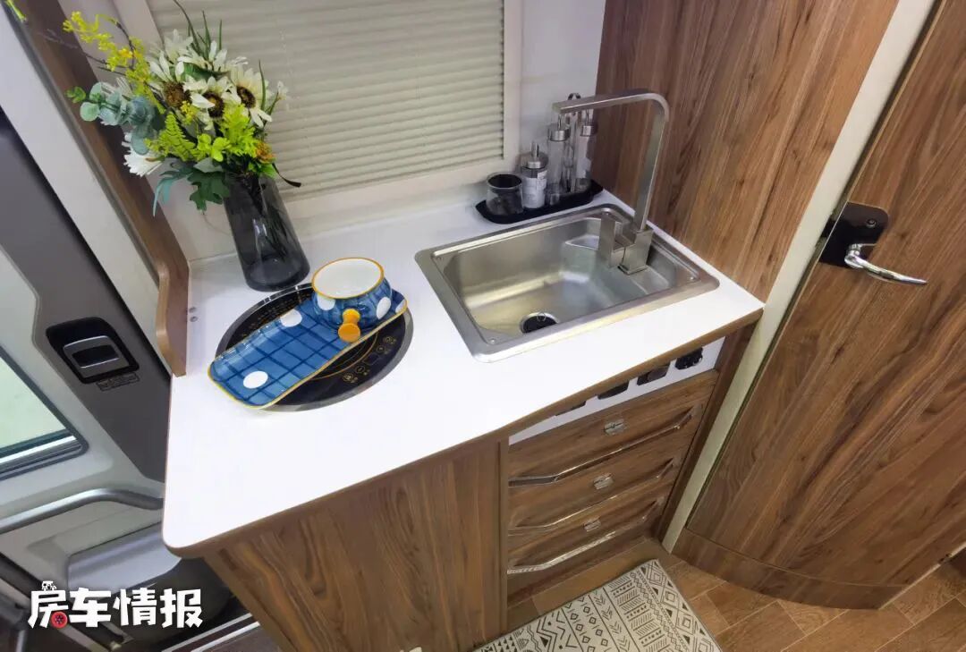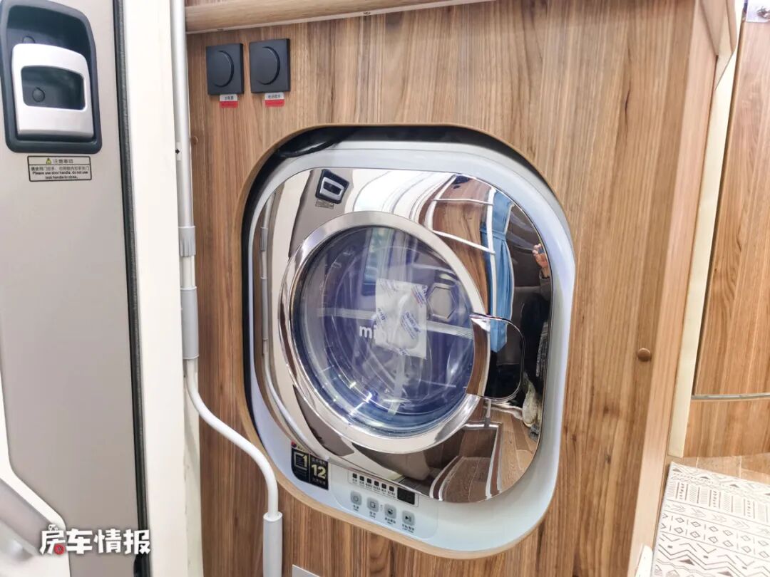 整车的厨房区是位于乘客门的后方,整体的尺寸并不是很大,但是也提供了比较丰富的烹饪设施,包括台面上方的电磁炉和不锈钢洗菜池,顶部上方还嵌入了一台微波炉,在厨房操作台的侧面还提供了一台mini洗衣机,满足日常所需。