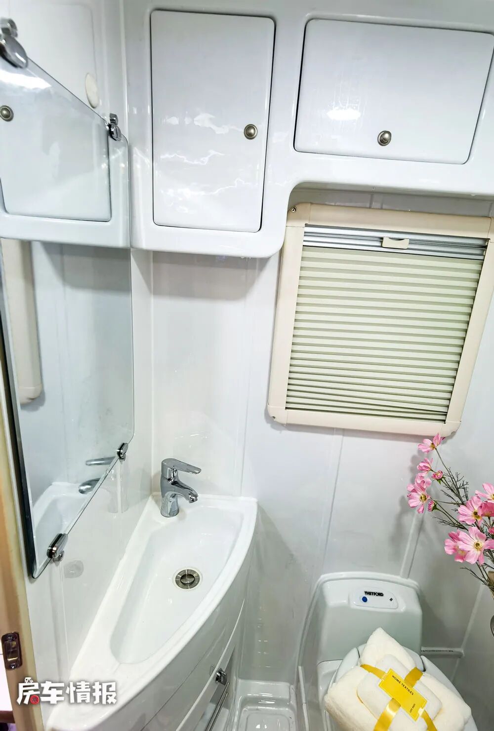 操作台后方为全车的独立卫浴室,采用了一体吸塑式的设计,既可以防潮防霉还能够延长整体的使用寿命,同时还配置了马桶、淋浴花洒、洗手台、梳妆镜、储物柜等,完全可以满足日常出行的洗漱需求。