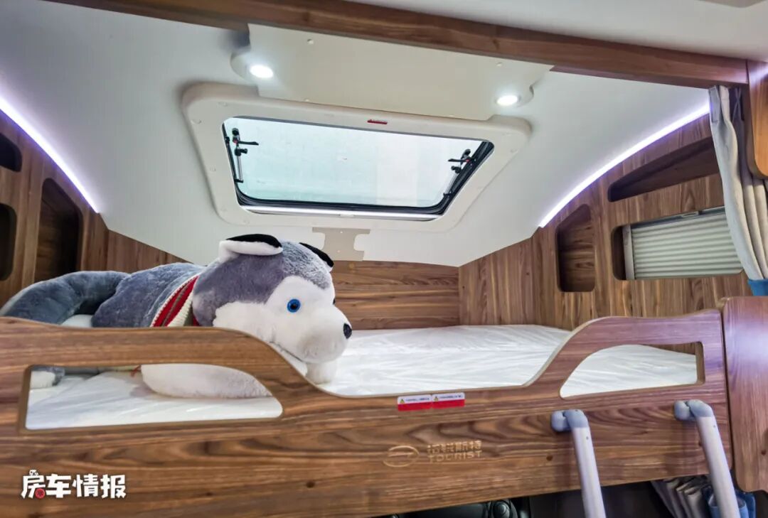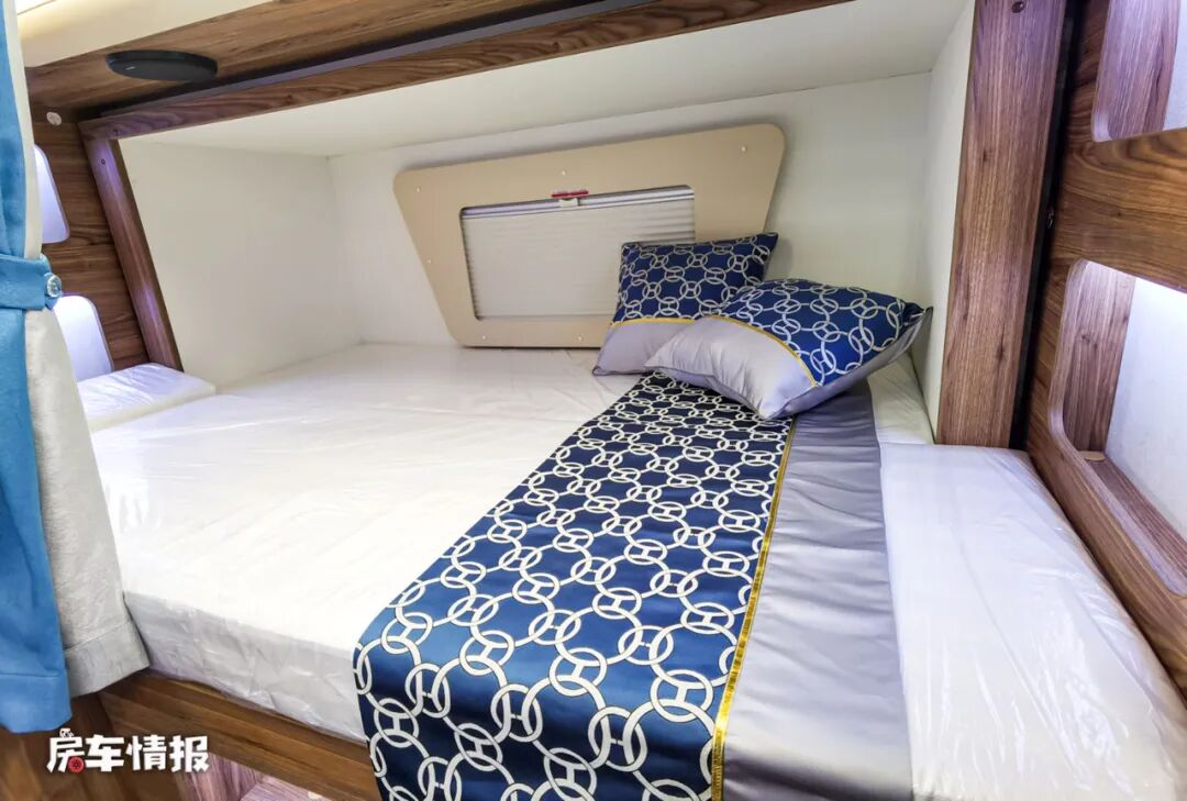 除此之外,在前方驾驶室顶部还标配了一张尺寸为2200*1450mm的额头床,三面带有窗户,可以保证整体的采光度以及可以通风换气,翻起床板,还可以看到下方嵌入的一台32寸液晶电视,满足日常的娱乐需求。