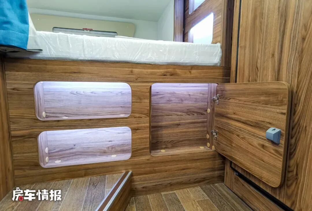 位于后拓展区内的横置尾床,尺寸达到了2230*1350mm,拓展后足以躺下两个成年人,同时床板下方还提供了多个储物柜,提升了整车的储物能力。