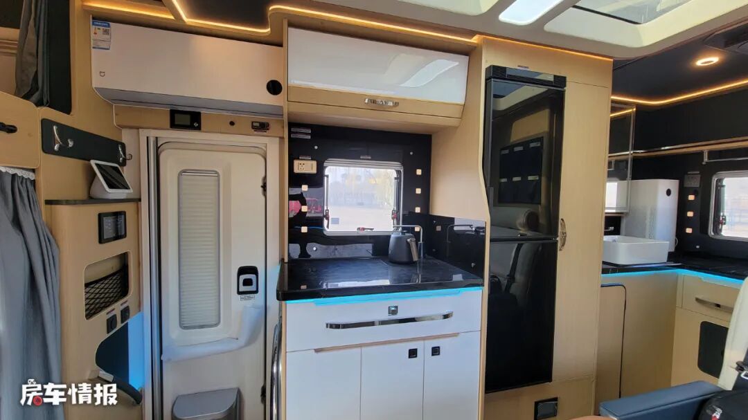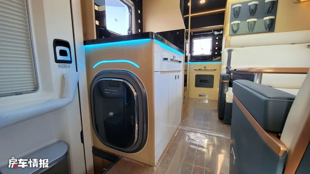 另一侧则是全车的厨房区,因为提供了外置的灶台,所以内部只配置了基础的烧水壶,侧面则嵌入了一台洗衣机,厨房区上下方都提供了储物空间,可以存放一些烹饪时所需的用具,同时还配备了一台微波炉,满足日常所需。厨房操作台后方则是一台156L上下双开门的冰箱,足够一家人出行存放食材的需求。