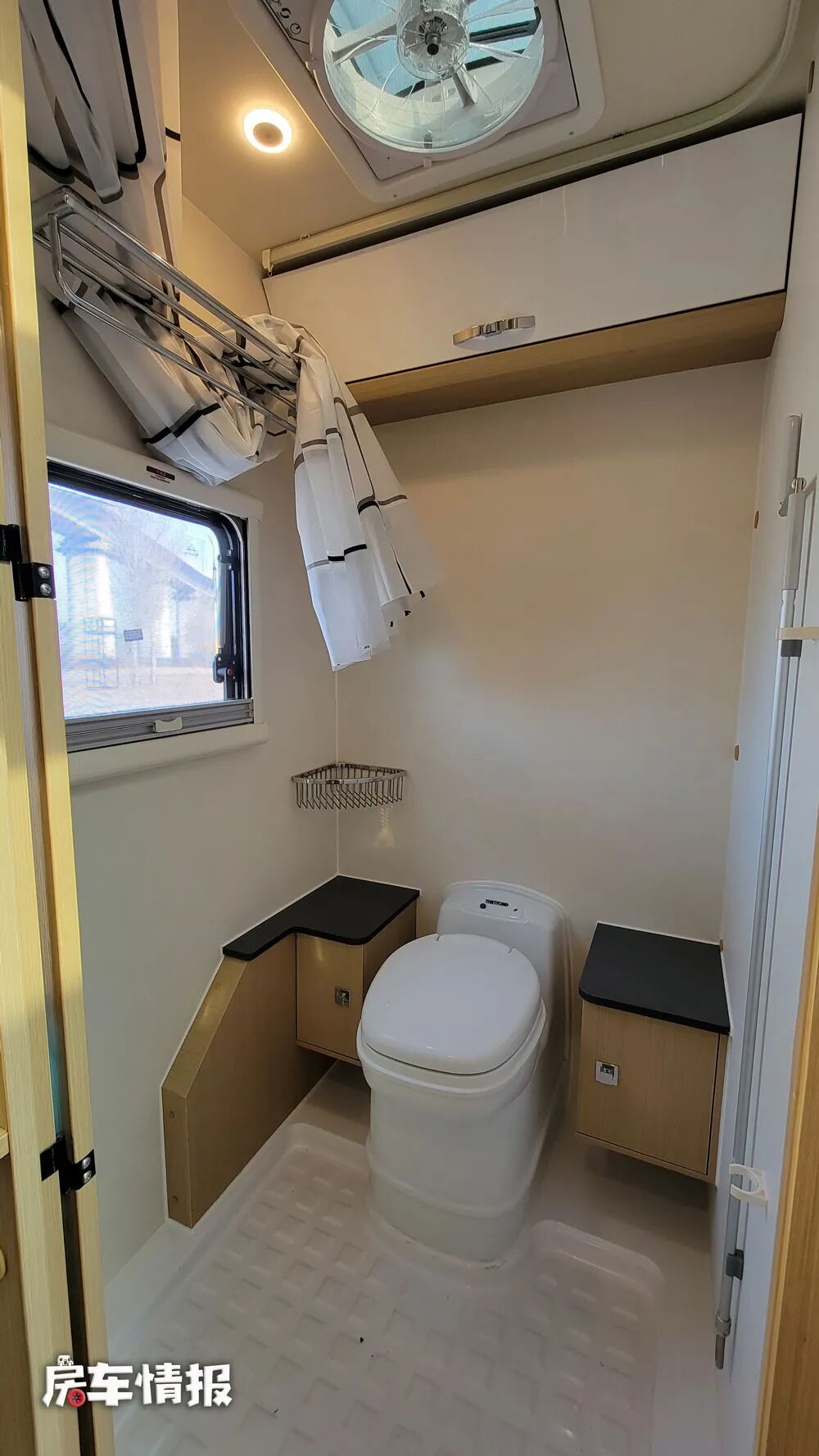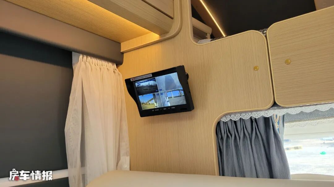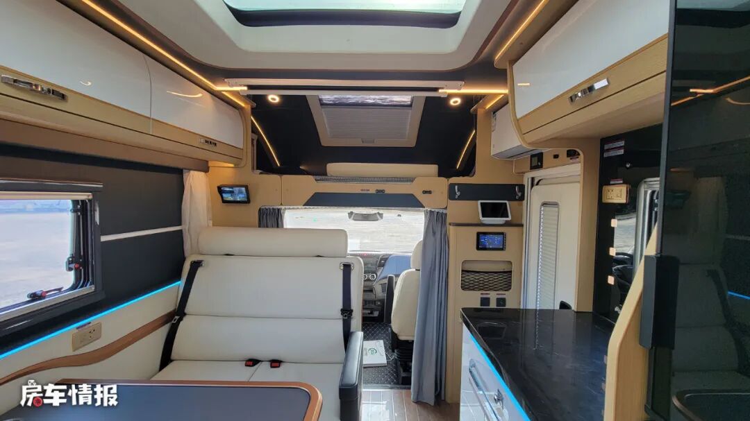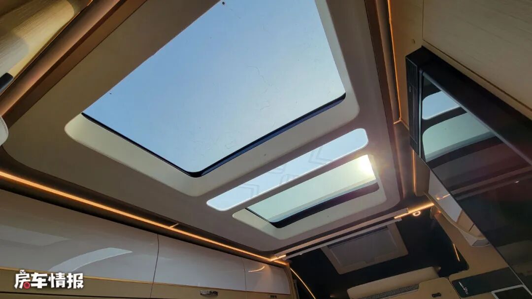 说到这里,您可能会察觉到还没有一张固定床,这款车也不同于其他主流车型提供了固定式的尾床,而是只保留了位于驾驶室上方额头区域内的额头床,尺寸为2100*1200mm,采用三面环窗的设计。