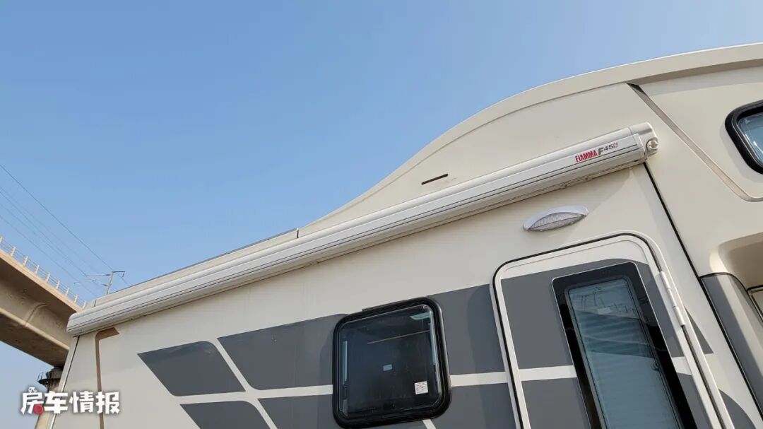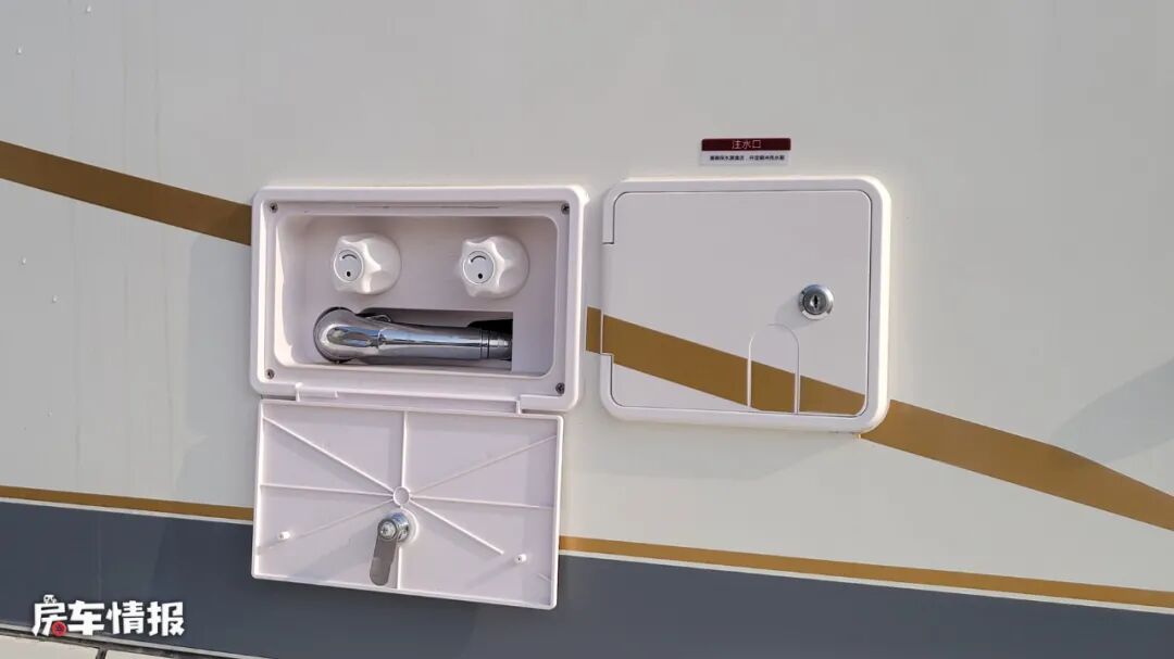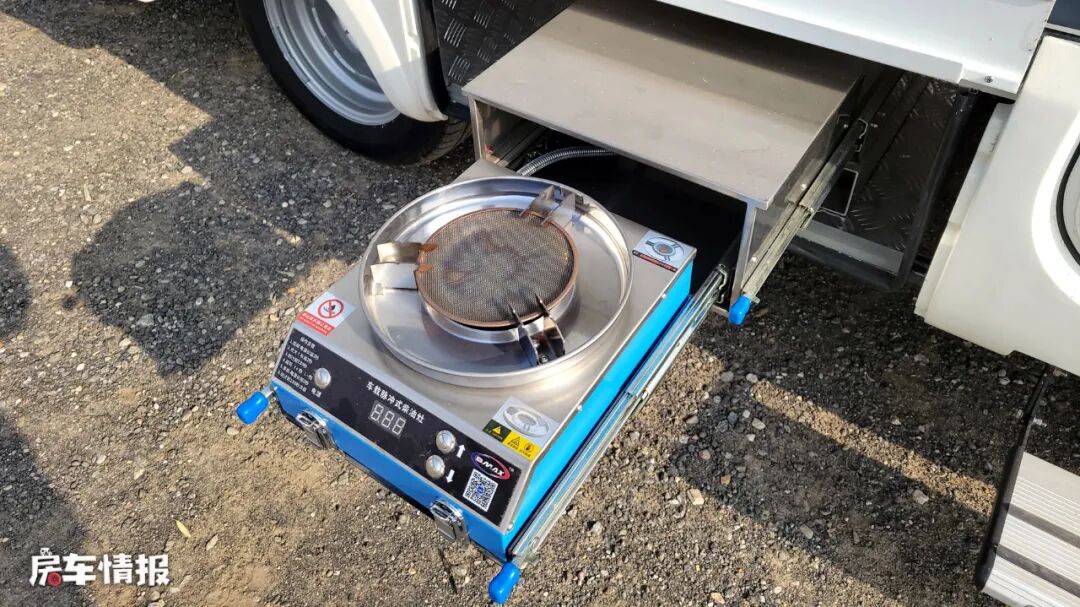 关于车身外部的配件,这款房车的配置还是比较完善的,包括车身右侧上方的遮阳棚、下方的淋浴花洒,以及最下方包裹在包边内的一台抽拉式燃油灶,更新换代之后的燃油灶也可以使车内外的能源得到统一化,平时从油箱就可以抽油使用了。
