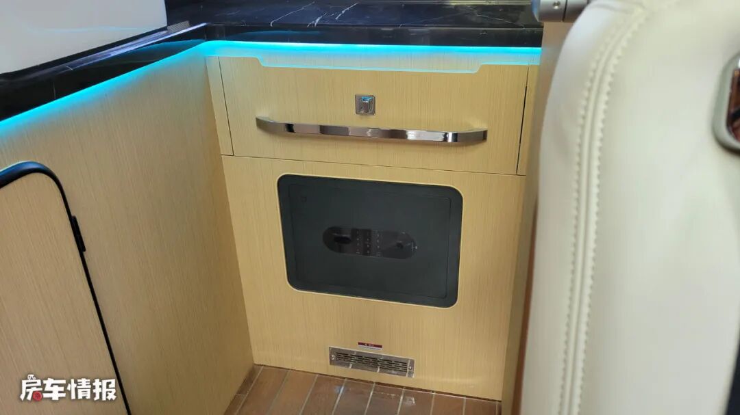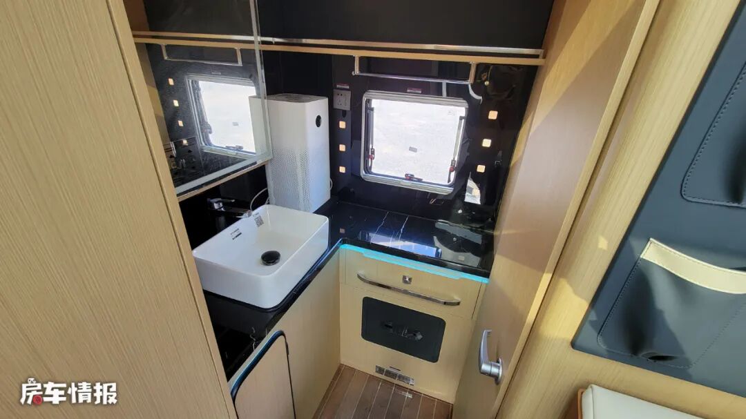 除去全景天窗之外,第二个亮点设计是尾部的开放式的盥洗区域,包括提供了科勒品牌的陶瓷洗手池、水龙头以及带有Led灯光的梳妆镜,内部还提供了可以存放洗漱用品的置物架,旁边则是一台小米的空气净化器,以保证车内空气的清新。另外在下方还提供了一台嵌入式的小米保险柜,如果旅行中会携带一些贵重的物品,也可以存放至此。
