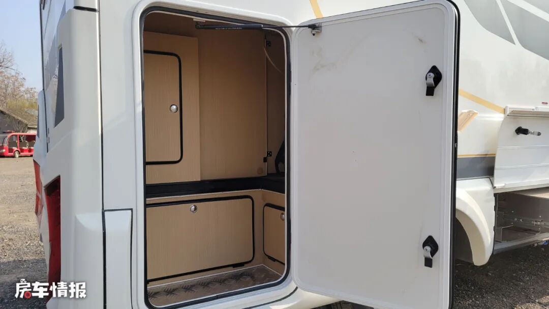 而尾部看似是一个贯穿式的储物舱门,但其实打开之后会发现和想象中的不太一样,内部并没有特别宽敞的贯通式储物空间,而是一些方便后期检查的检修维护口,不过好在整理的容积还是能够放下一个大号的行李箱。