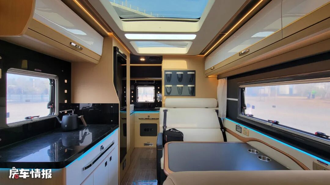 进入车厢内部之后,不得不说让王师傅都能爆粗口,我看了之后也觉得不像一辆普通的房车,更偏向于一辆商旅车的设计,包括整体的布局、装修和设计,都非常新颖有创意。