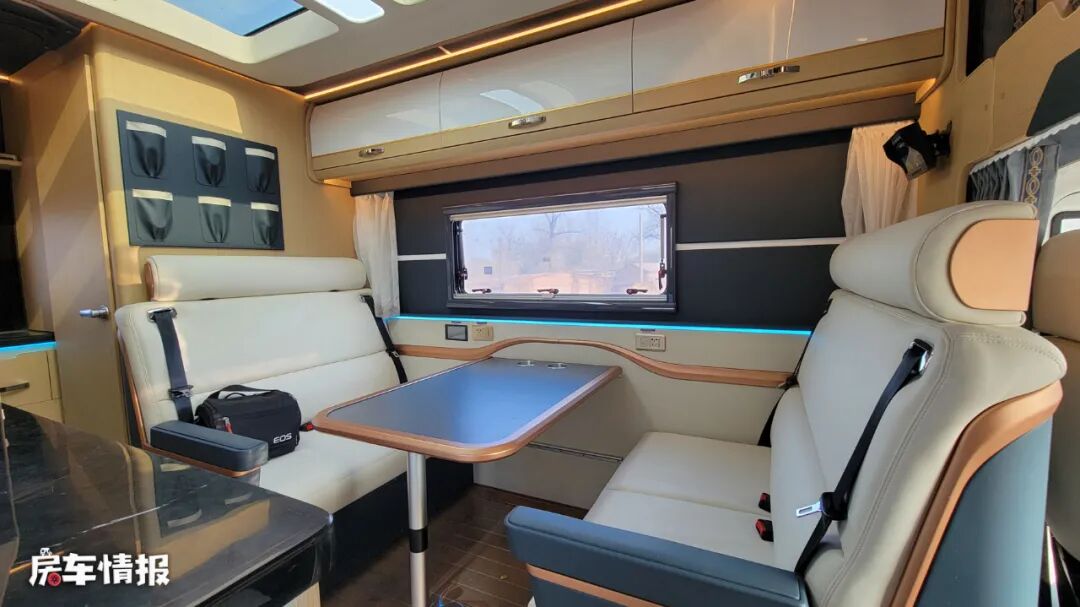 全车的会客区采用经典的四人对卡座沙发+餐桌的设计,而且餐桌和侧面壁板都加入了包边的处理,更加的精致,沙发上一共配置了四条安全带,结合主副驾驶座椅,全车在行驶过程中最多可以乘坐6个人。同时上方还匹配了储物吊柜,以及在前方还带有四路监控的屏幕,也方便随时观察车辆周围的情况。当晚上需要休息的时候,还可以将沙发拼接组合成一张沙发床使用。