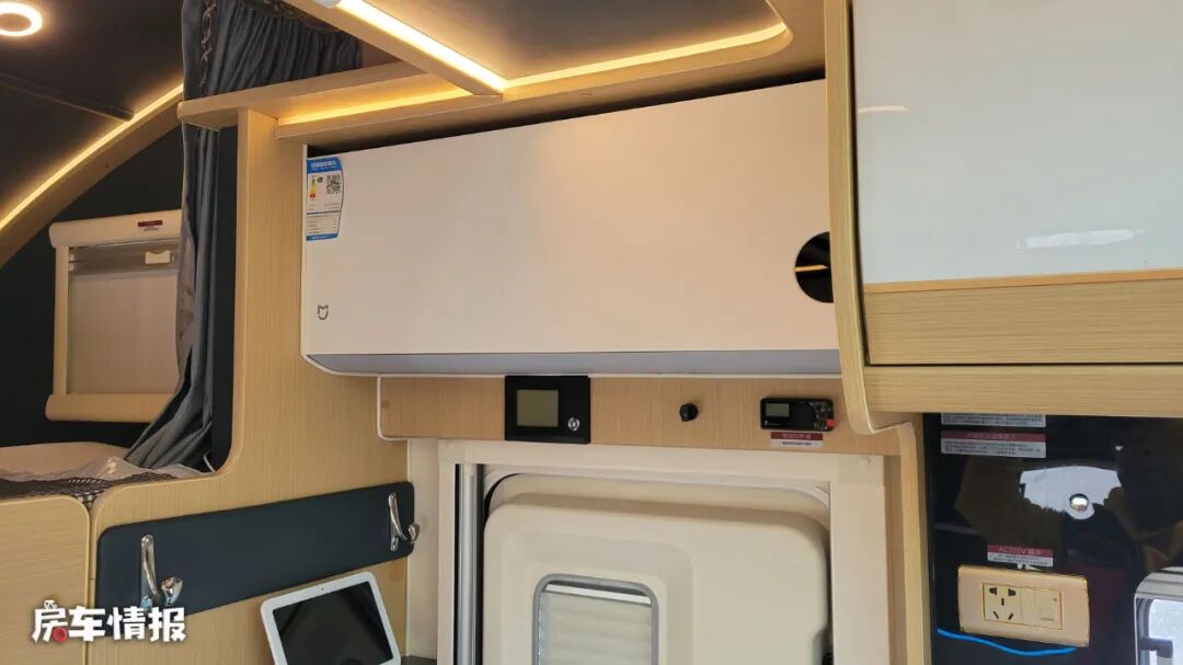 电路上,这款房车搭载了一台3000W的逆变器,提供800Ah的锂电池,由于顶部是天窗的设计,所以只配置了280W的太阳能电池板;水路上拥有190L净水箱和80L灰水箱,满足日常的用水用电需求。同时车内还提供了一台1.5P的小米空调,以保证车内的舒适的居住环境。