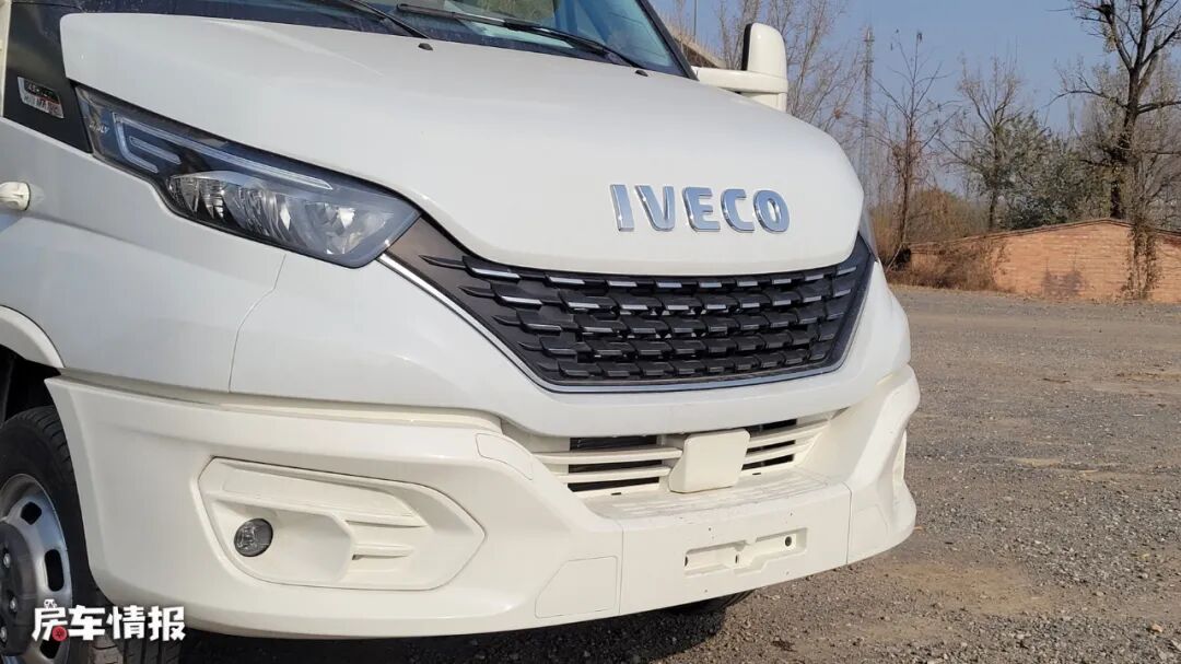 这是一款基于4.5吨进口依维柯New Daily底盘所打造的铂驰C型房车,五横排点阵式的中网不难看出来进口的底盘,整车在外观造型上还是采用了市面上比较主流的流线型大额头式设计。