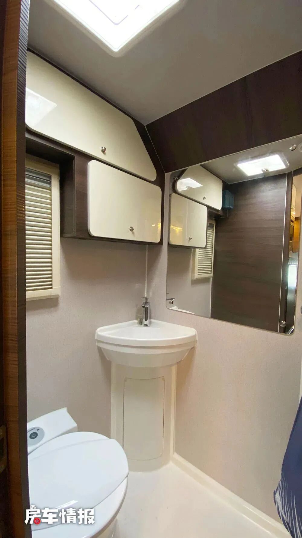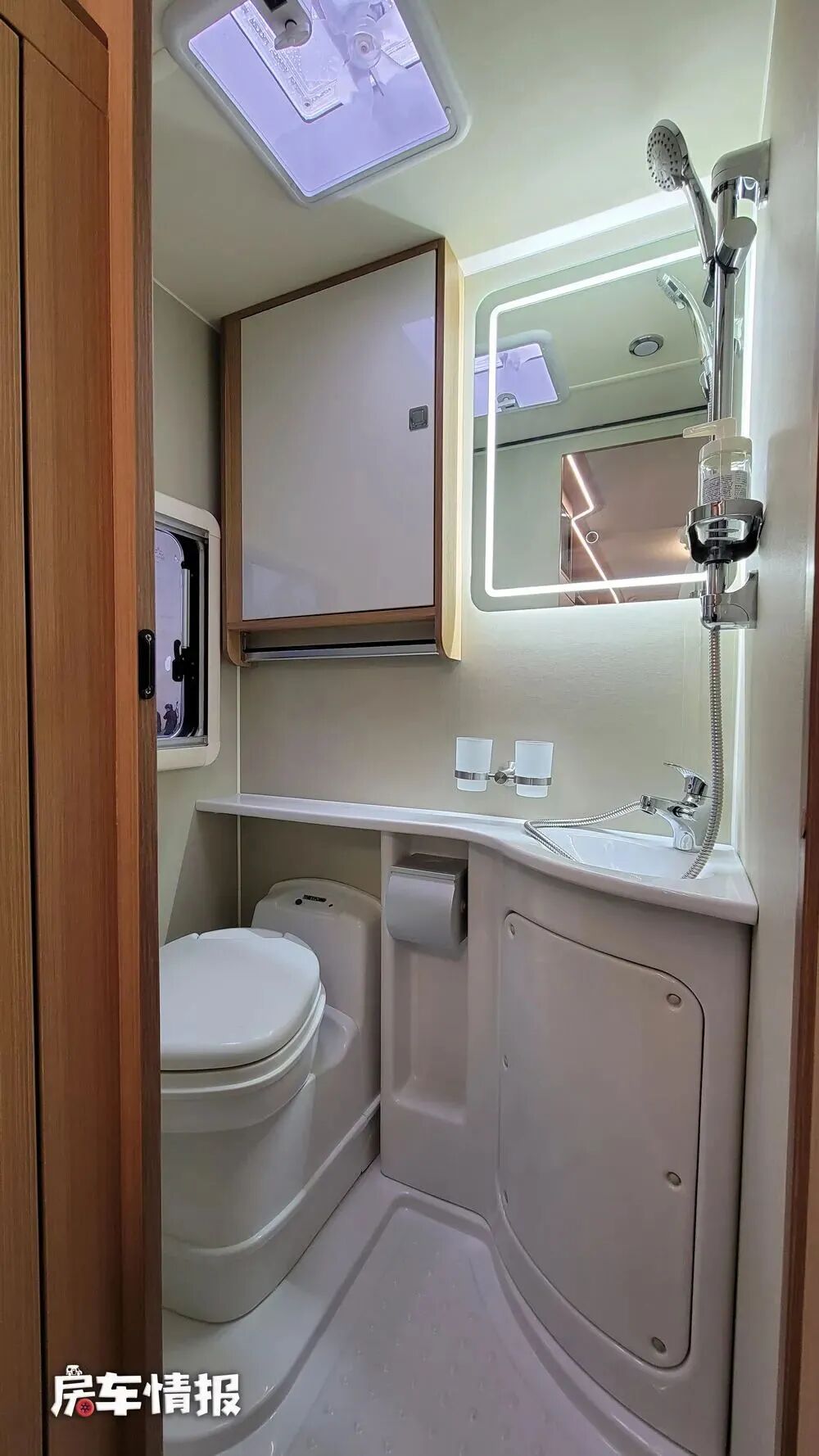 位于车厢尾部的卫浴区,内部的配色与外面的生活区配色相呼应,同样提供了比较完善的洗漱设施,以满足后期的洗漱需求。