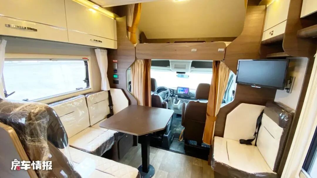 会客区使用了B型房车中常见的双人沙发座椅+餐桌布局,可以为后方的床铺预留出更多的空间。同时在主驾驶后方还提供了一台24寸液晶电视,可以提供基础的娱乐需求。