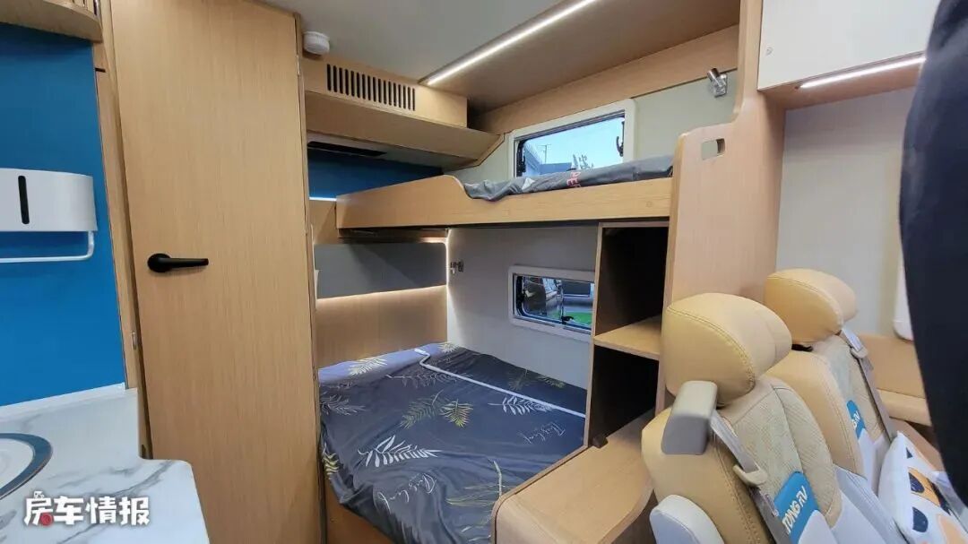 最后是位于车厢尾部内采用纵置采子母床设计的休息区,下床尺寸约为1950*1150mm,上床尺寸约为1950*750mm,总共可以容纳一家三口使用,另外上床还可以翻折起来,为下床提供更多的空间。