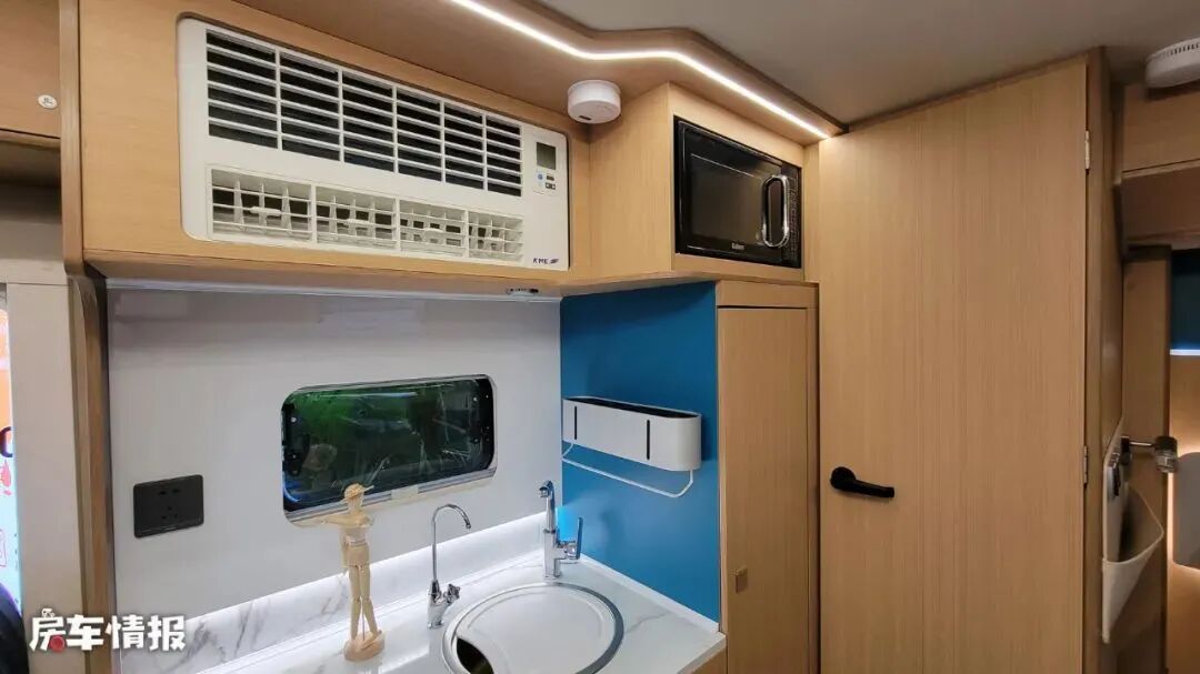 乘客门后方的厨房区也是配置了比较基础的烹饪设施,包括电磁炉、不锈钢洗菜池、148L上下双开门的冰箱以及一台微波炉,可以满足日常烹饪的需求。