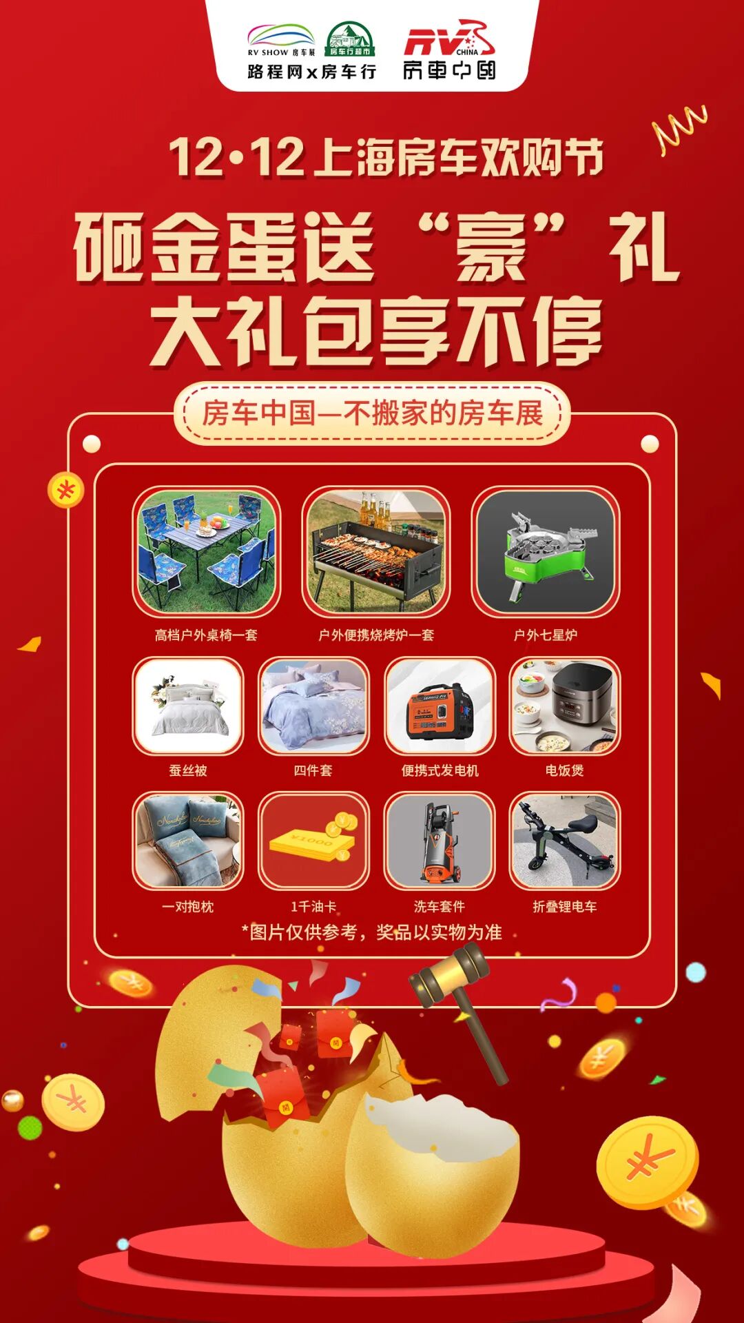 双12上海房车欢购节,百款车型低价出售,砸金蛋送好礼,预约即可免费试乘试驾,为了让房车爱好者可以看到多款房车,双12,房车中国联合多家知名房车品牌给房车爱好者安排一场不搬家的房车展,房车中国露营地等您参与。