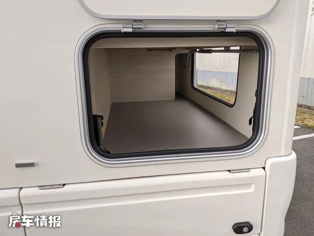 车身外部相比于国内轻卡房车提供的比较丰富的生活配件来说,配置的比较简单,带有遮阳棚和基础的水电接驳口,以及后方带有一个贯通式的储物舱,以满足日常的基本需求。