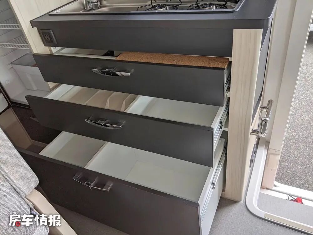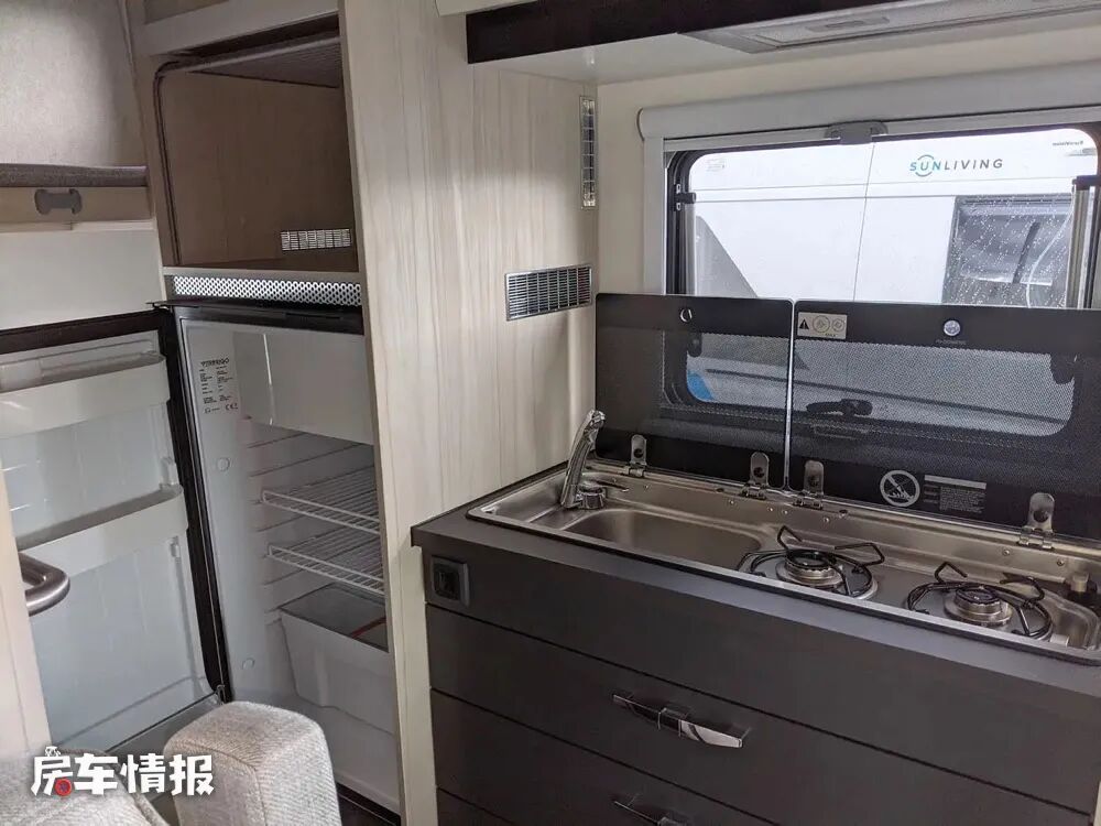 厨房区位于乘客门的后方,整体的配套设施还是非常丰富的,在操作台面上提供了翻盖的不锈钢洗菜池以及翻盖的双孔燃气灶,顶部还配置了一台抽油烟机,下方则提供了多个储物抽屉,保证存放日常的烹饪用具等物品。后方则是一台单开门的冰箱以及一台微波炉,满足日常的烹饪需求。