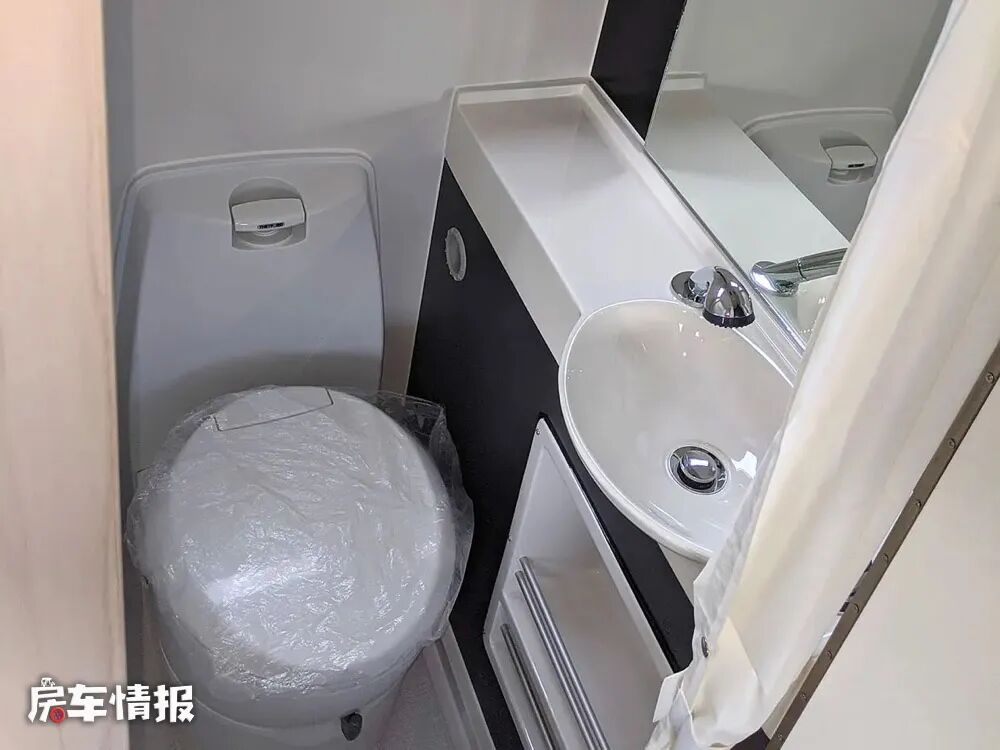与之相对的是一间独立的卫生间,相比国内轻卡房车的大空间来说,这个卫生间的空间似乎有点拥挤,内部提供了盥洗台、抽拉式淋浴花洒、马桶等基本的配置,也可以解决日常的基础洗漱问题。