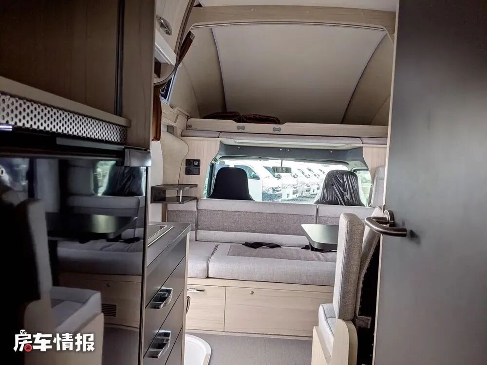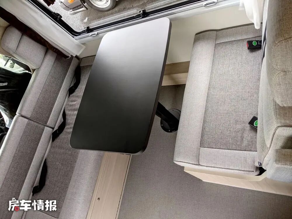 进入车厢内部,整体的装修风格还是比较朴实雅致的,在最前方是全车的会客区,采用对卡座沙发+升降餐桌的设计,驾驶室后方的沙发为左右贯通式的,配置了三条安全带,平时可以乘坐三个人,与之相对的双人沙发则配置了两条安全带,也可以乘坐两个人。