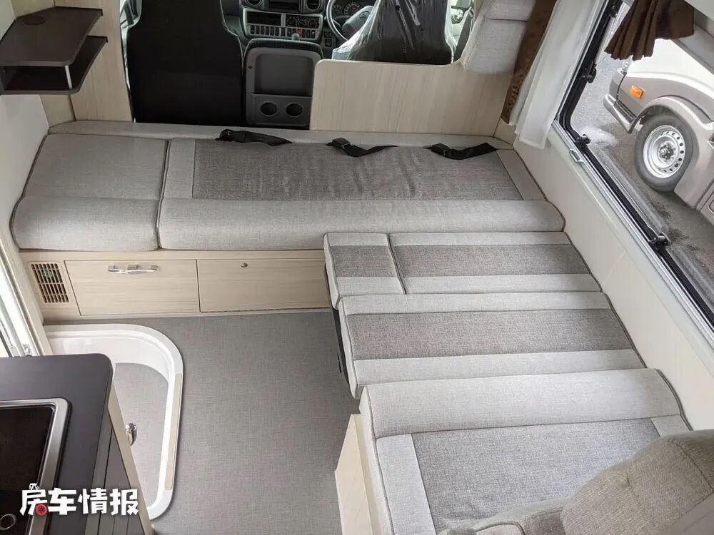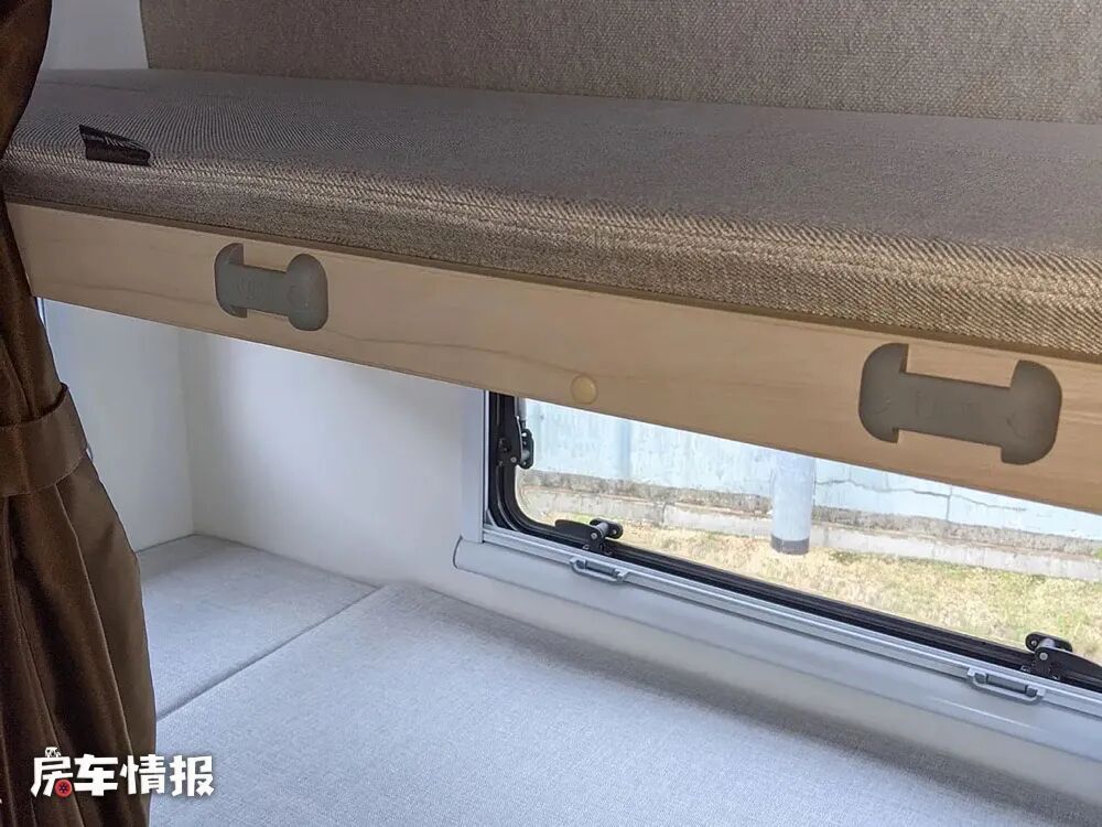 除此之外在驾驶室顶部的额头区域内也提供了一张带有抽拉拓展功能的额头床,只不过因为不带有侧窗,所以整体光线稍差一些。