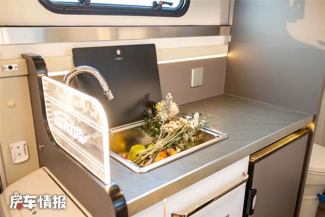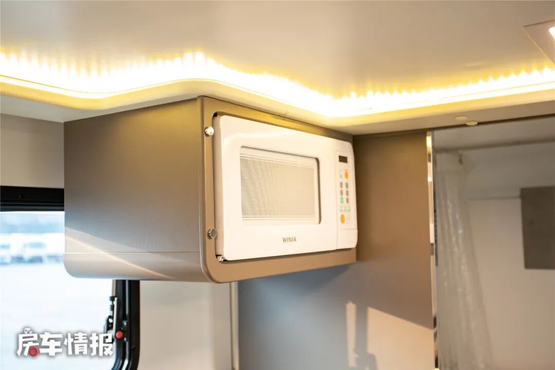厨房区位于乘客门后方,台面上带有翻盖的洗手盆,下方则提供了一台嵌入式的88L房车专用冰箱,内部也带有单独的冷冻区域,满足日常分类存放食材的需求。另外顶部还悬挂了一台微波炉。