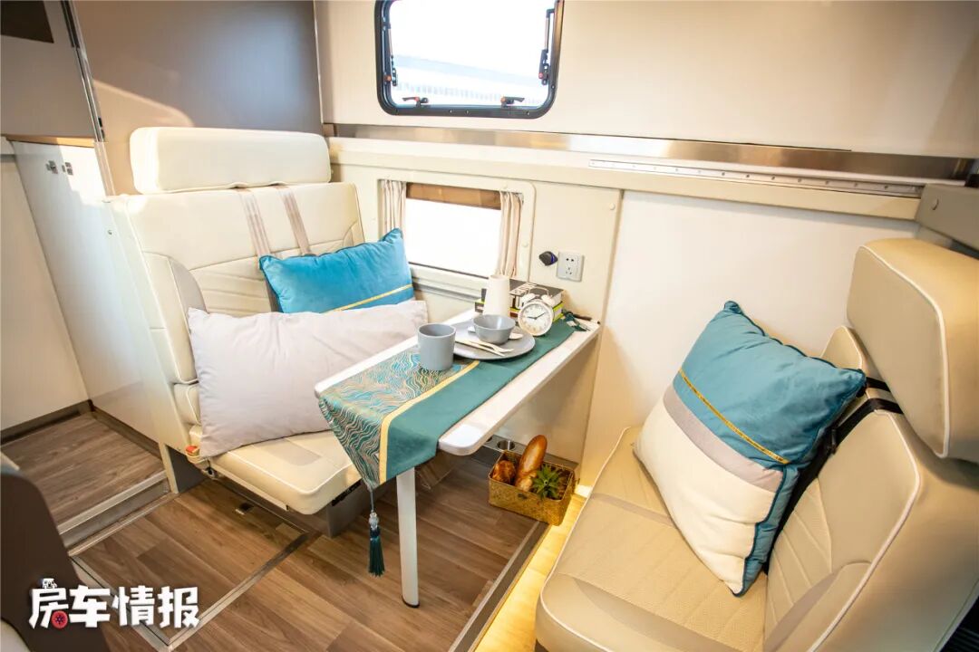 这款房车也是采用了大空间的四人会客厅设计,配有四人对卡座+升降式餐桌,可以满足日常的就餐会客区域,而此外它还充当着床铺的功能,相互拼接后可以组合成一张尺寸为2000*800mm的单人沙发床。