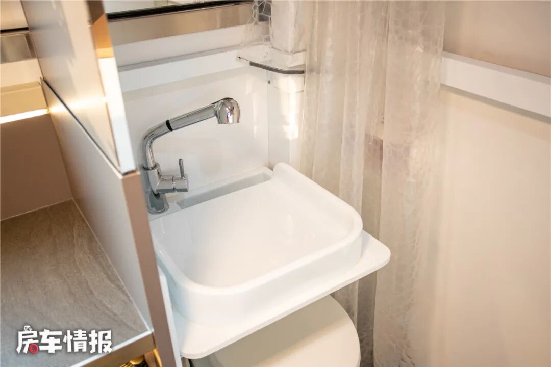 车厢尾部,是一间封闭式的卫生间,内部空间还是非常可观的,配置了马桶、隐藏式洗手盆、抽拉式花洒、梳妆镜等,满足日常的洗漱需求。