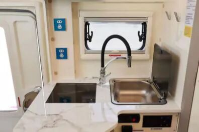 车身右侧为厨房区域,2000W旌航专用款电磁炉,房车专用油烟机,微波炉,下方为3KG大宇洗衣机带烘干。