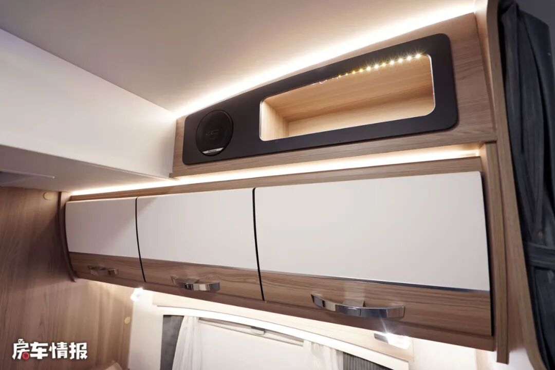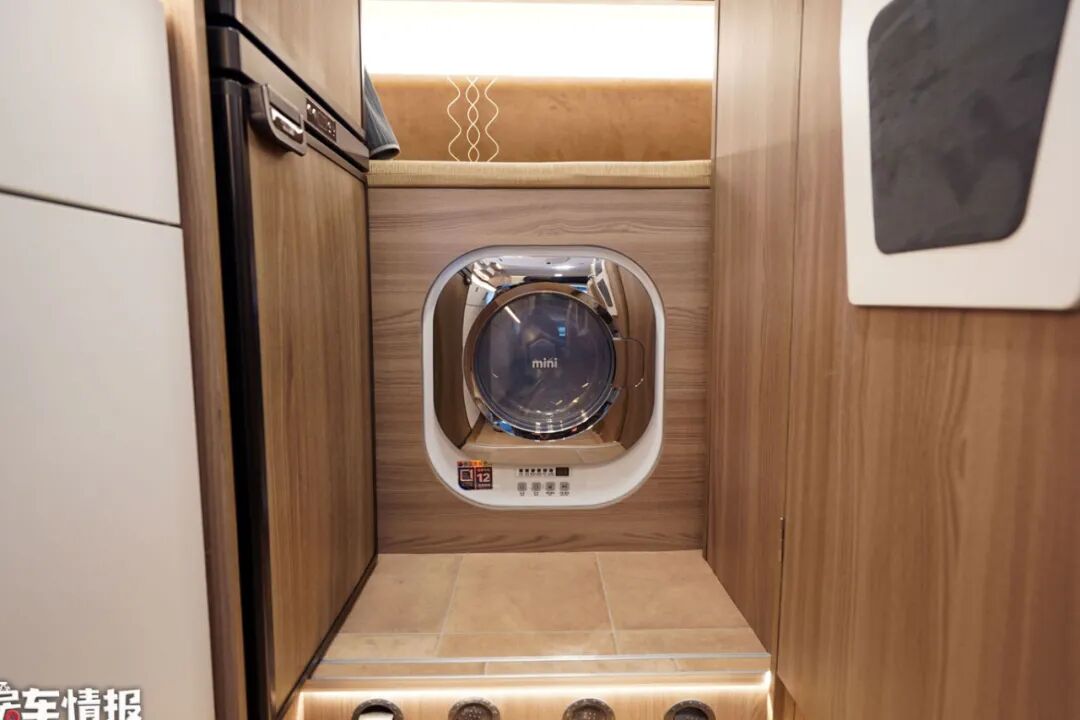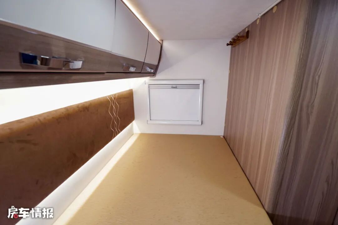 这款房车的第二个固定床铺位于车厢尾部,采用了横置双人床的设计,尺寸为2200mm*1150mm,平时也可以满足两个体型娇小的成年人睡觉和休息的需求,在侧面的壁板上还加入了氛围灯的设计,为休息区营造出了更加温馨的感觉,顶部则提供了基础的储物吊柜,可以存放日常的一些换洗的衣物,拿取的时候也比较顺手方便。尾床下方则嵌了一台洗衣机,满足日常洗衣物的需求。