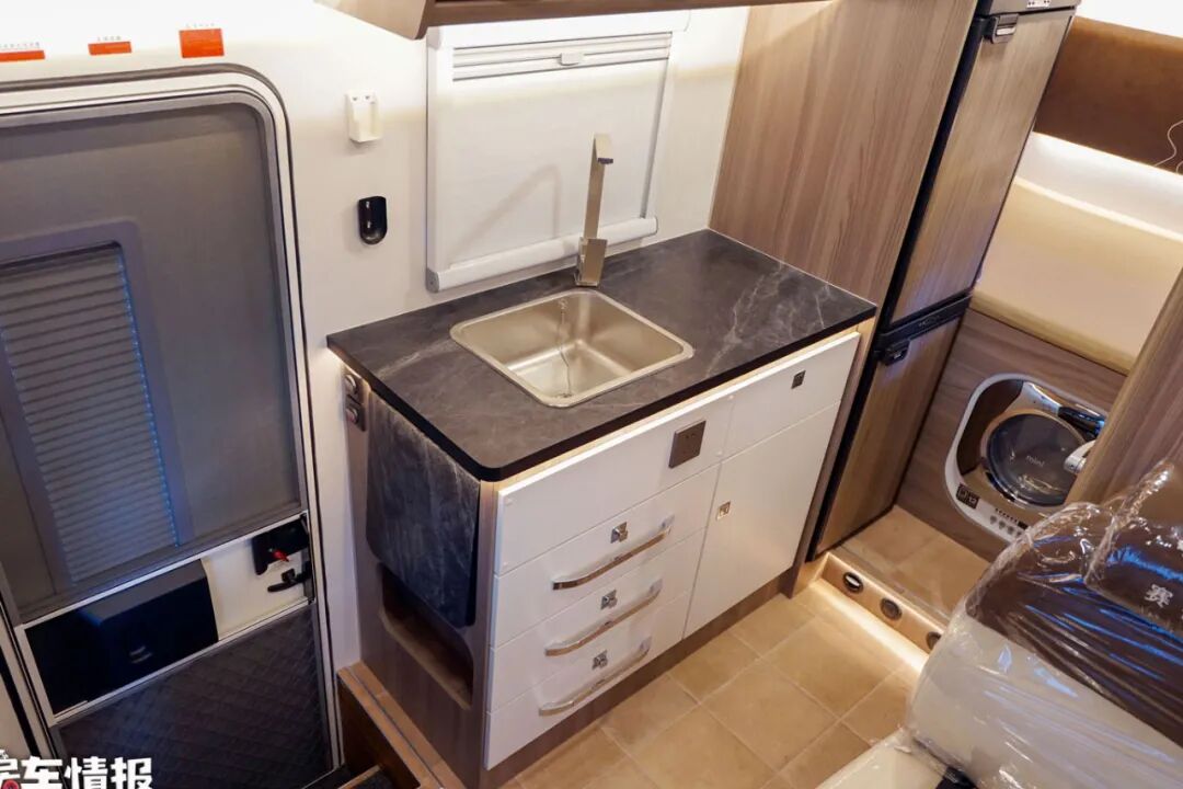 厨房区位于乘客门后方,操作台外侧提供了可拓展的小桌板,可以增大原始的使用面积,用来备菜,台面上带有水槽,但并没有标配电磁炉,不过因为带有电源插口,后期也可加装便携式的电磁炉,另外同时整个厨房区提供了储物空间、微波炉以及一台152L上下双开门的冰箱,也可以满足日常的烹饪需求。