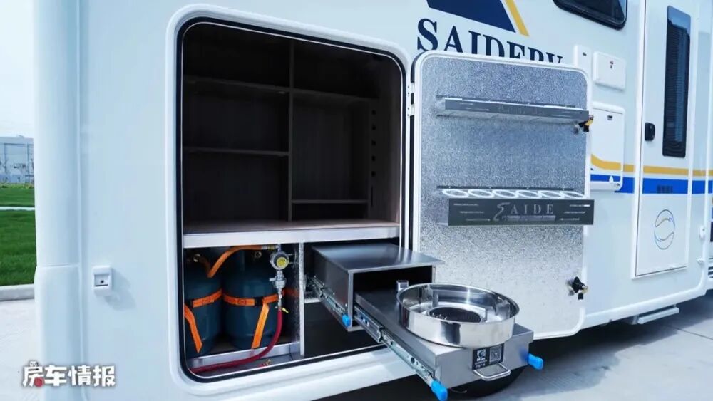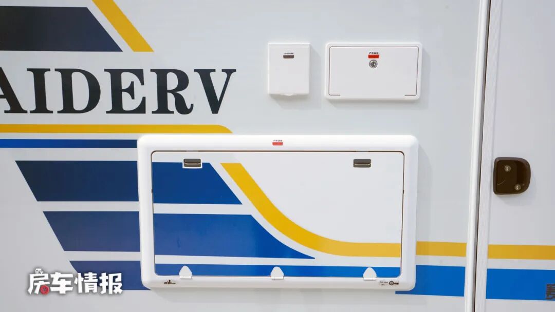 在车身尺寸方面,全车长宽高分别为5995*2450*3150mm,与主流的C型房车表现相当,临界6米的车身尺寸也符合蓝牌C 本的驾驶规定,在车身外部也匹配了比较丰富的户外生活设施,包括遮阳棚、外置翻板、储物舱、抽拉户外灶以及水电接驳口等,可以满足户外的生活需求。