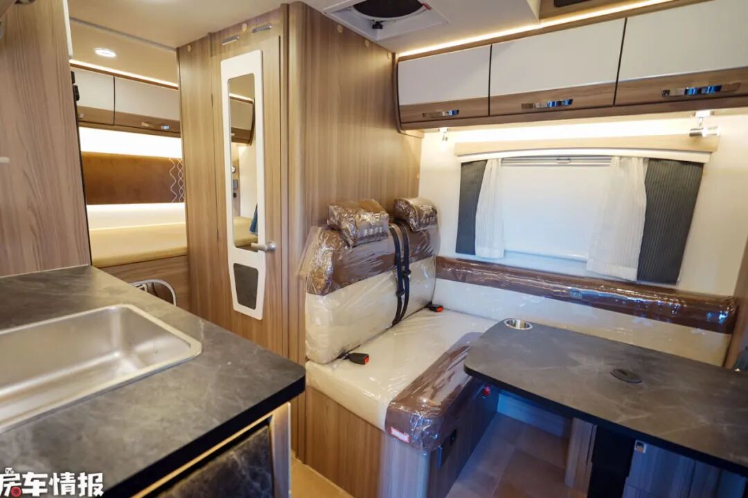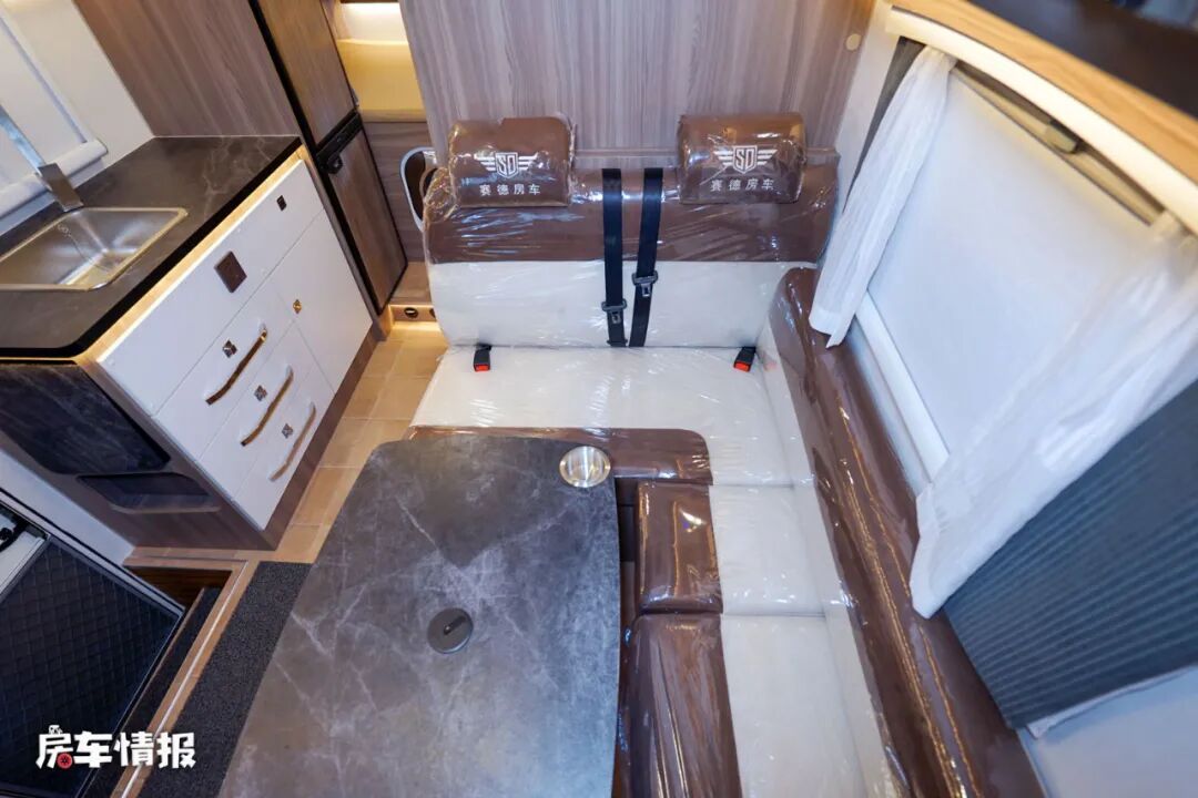 全车的会客区则采用了当下比较受欢迎的L型沙发座椅+升降餐桌的布局设计,并配置了两条安全带,结合主副驾驶座椅,在行驶过程中最多可以乘坐四个人,晚上睡觉的时候还可以变为一张临时的沙发床,使用起来相对灵活便捷。