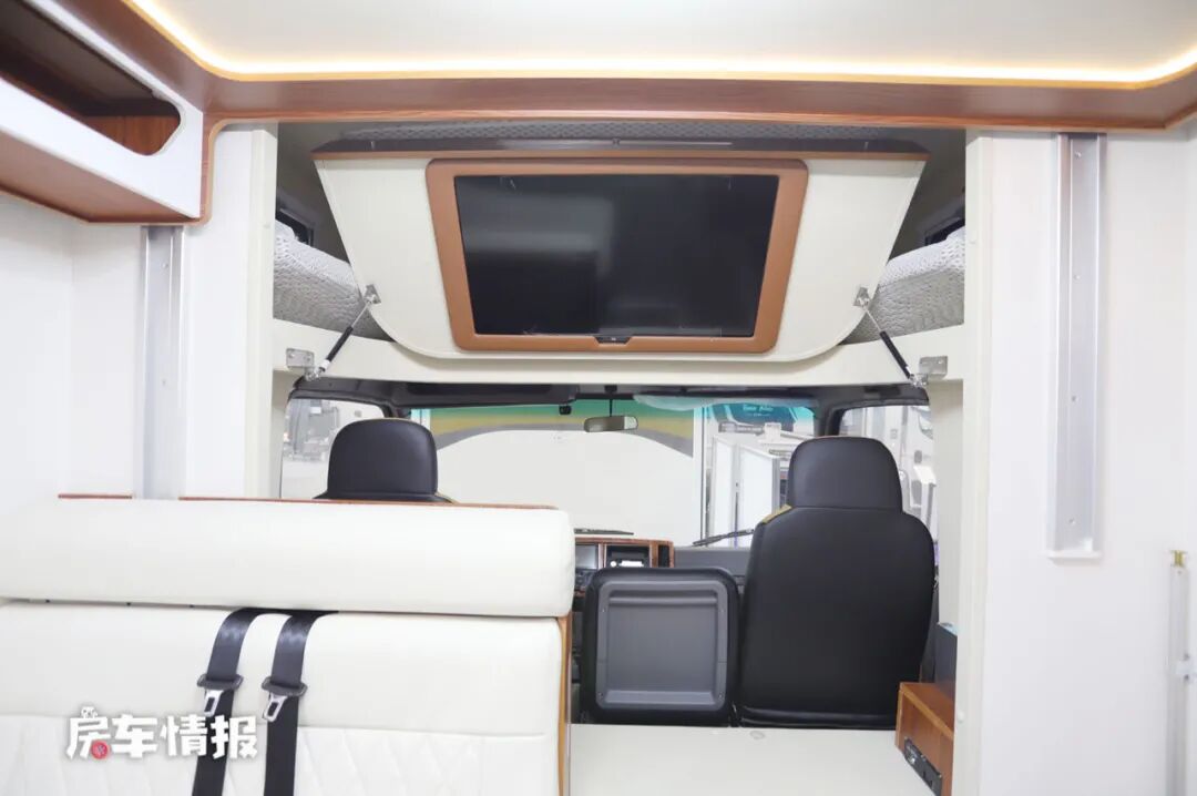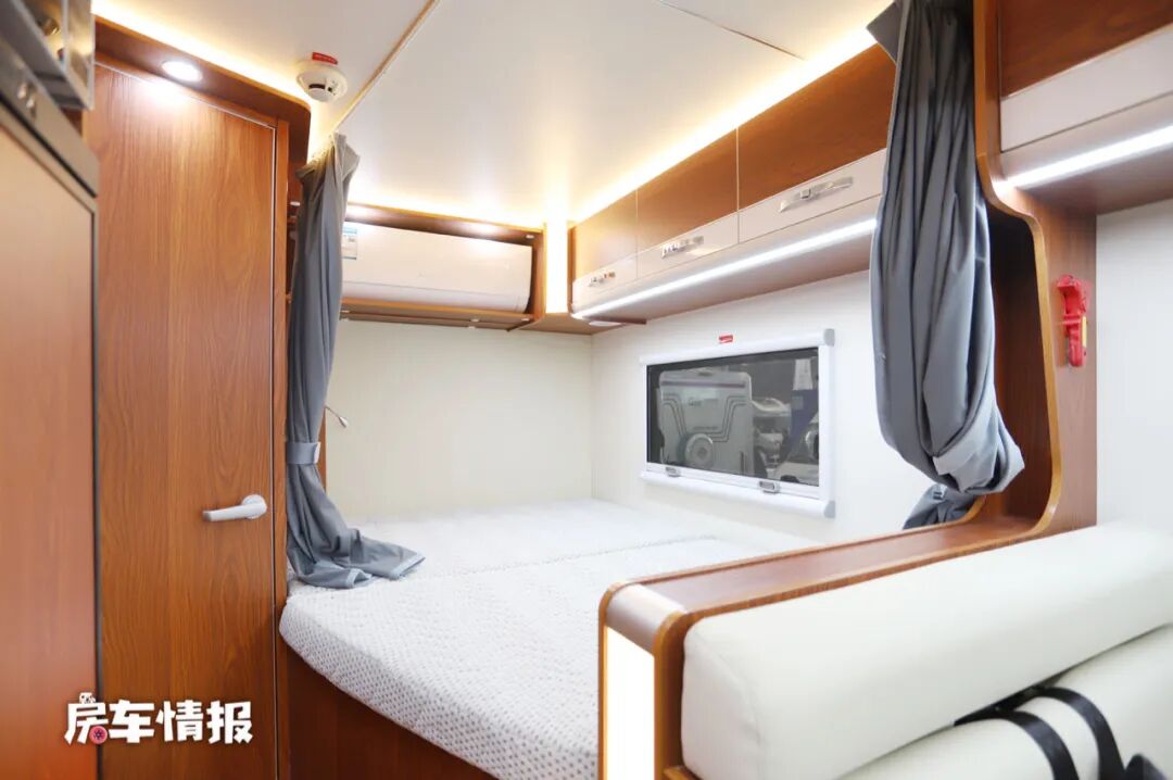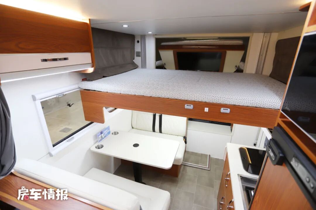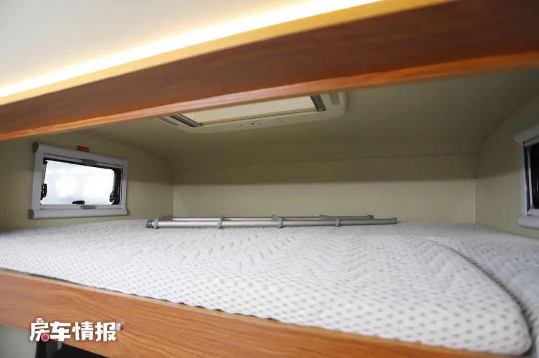 除此之外,在前方驾驶室上方的额头内还提供了一张双人额头床,平时也能够为两个成年人提供休息睡觉的地方,额头床两侧带有外推窗,顶部还有一个天窗,整体感觉也十分的通透。
